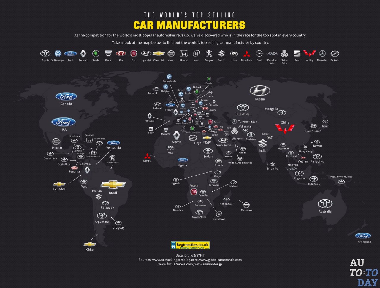 В инфографике, представленной ниже Regtransfers в Великобритании, мы можем видеть, что Toyota имеет значительное преимущество в ключевых регионах по всему миру, включая Латинскую Америку, Азию и Африку, и возглавляет диаграммы продаж во многих странах, включая Коста-Рику, Уганду, Анголу, Танзанию, Объединенные Арабские Эмираты, Сингапур, Индонезию и Австралию.