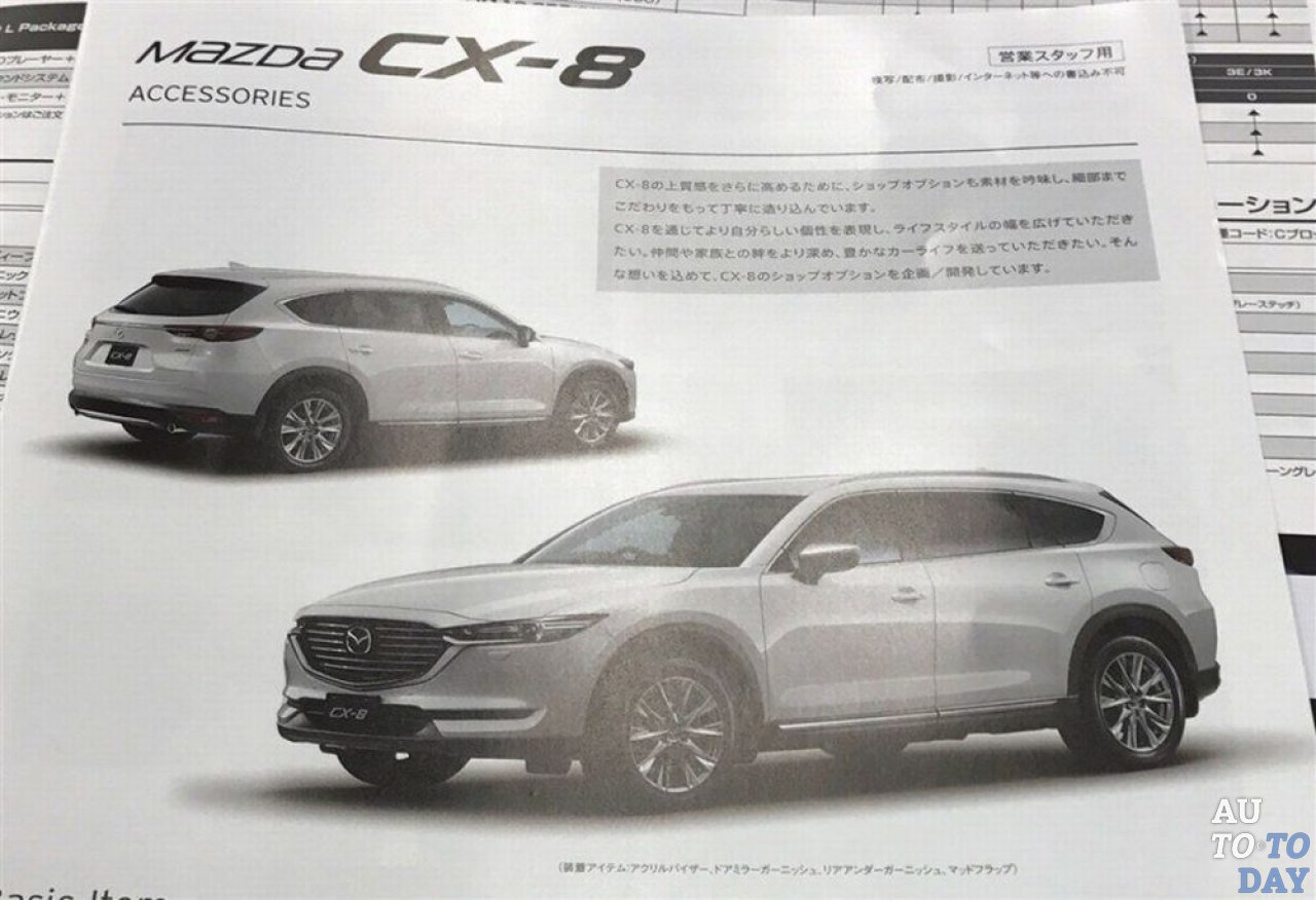 Через несколько дней после того, как Mazda представила первую официальную фотографию внешнего вида будущего внедорожника CX-8, в сеть попала брошюра с изображениями эксклюзивной японской модели с тремя рядами сидений. Автомобиль показан во всей красе как снаружи, так и внутри. Передняя часть, по-видимому, частично позаимствована у последнего CX-5. Это выражается в похожих тонких фарах, а также оригинальном зазоре между капотом и хромированной решеткой радиатора. Сама решетка имеет горизонтальные перекладины, аналогичные тем, что имеются у новой модели CX-9.
