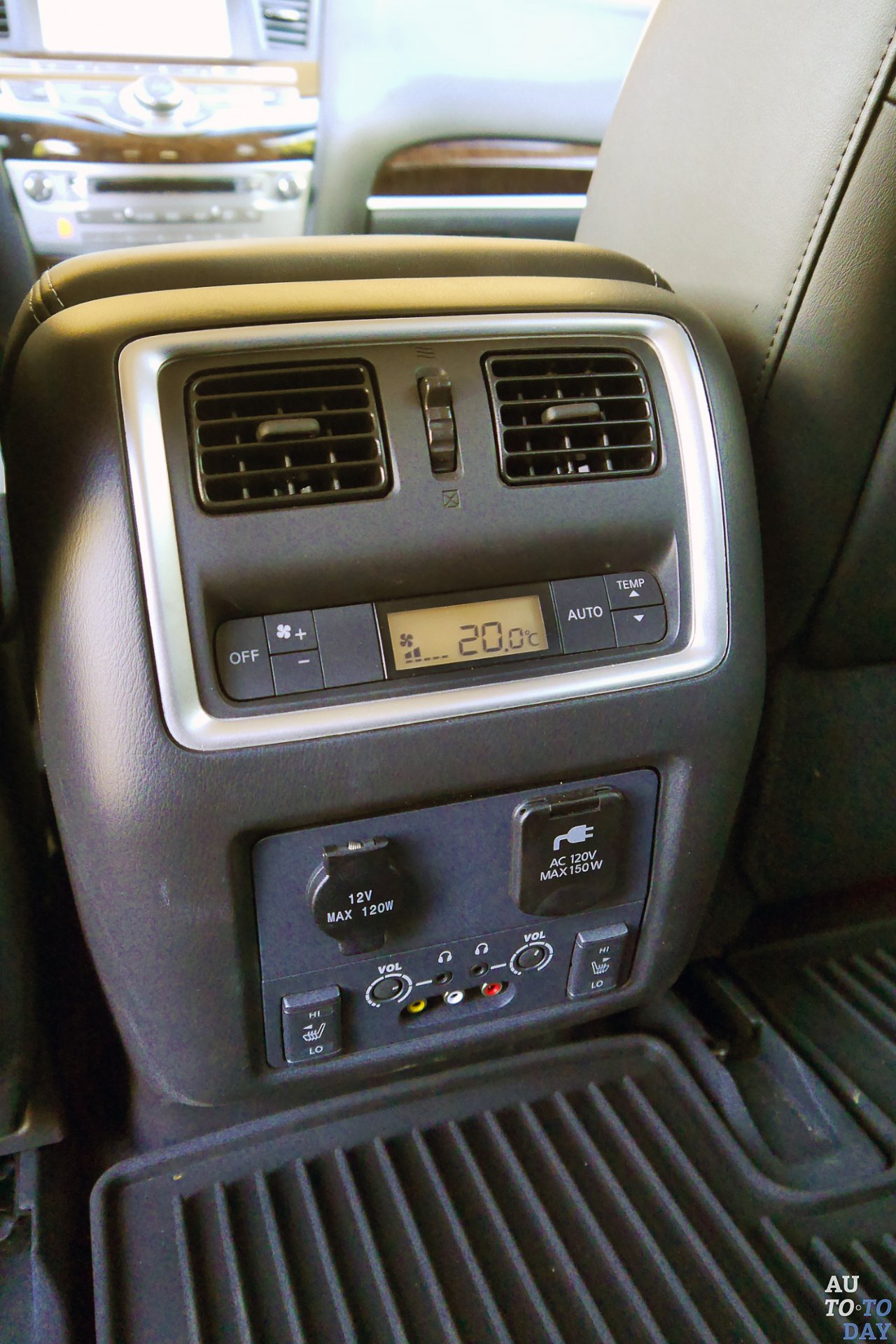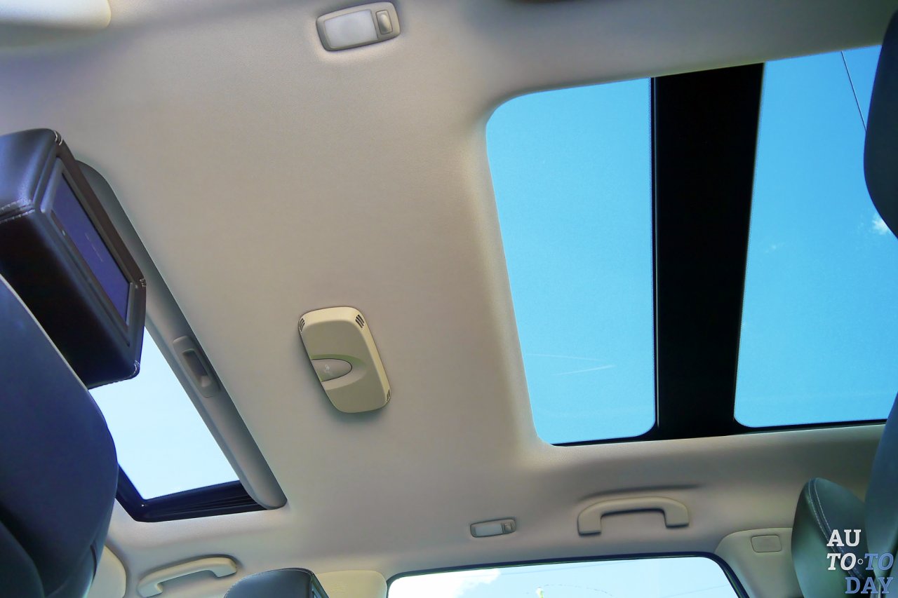 Часть вторая, просторная. На втором ряду комфорта и всяких примочек не меньше, а может и даже больше, чем спереди. Судите сами – два монитора, пара беспроводных наушников, отдельные регуляторы громкости, 12-вольтовая розетка, видеовходы, подогрев кресел и регулировка угла наклона спинки. К сожалению, в виду отсутствия необходимого адаптера для нашей игровой приставки, проверить дисплеи не удалось. Если сдвинуть второй ряд максимально назад, то в распоряжении пассажиров оказывается просто неограниченное пространство.