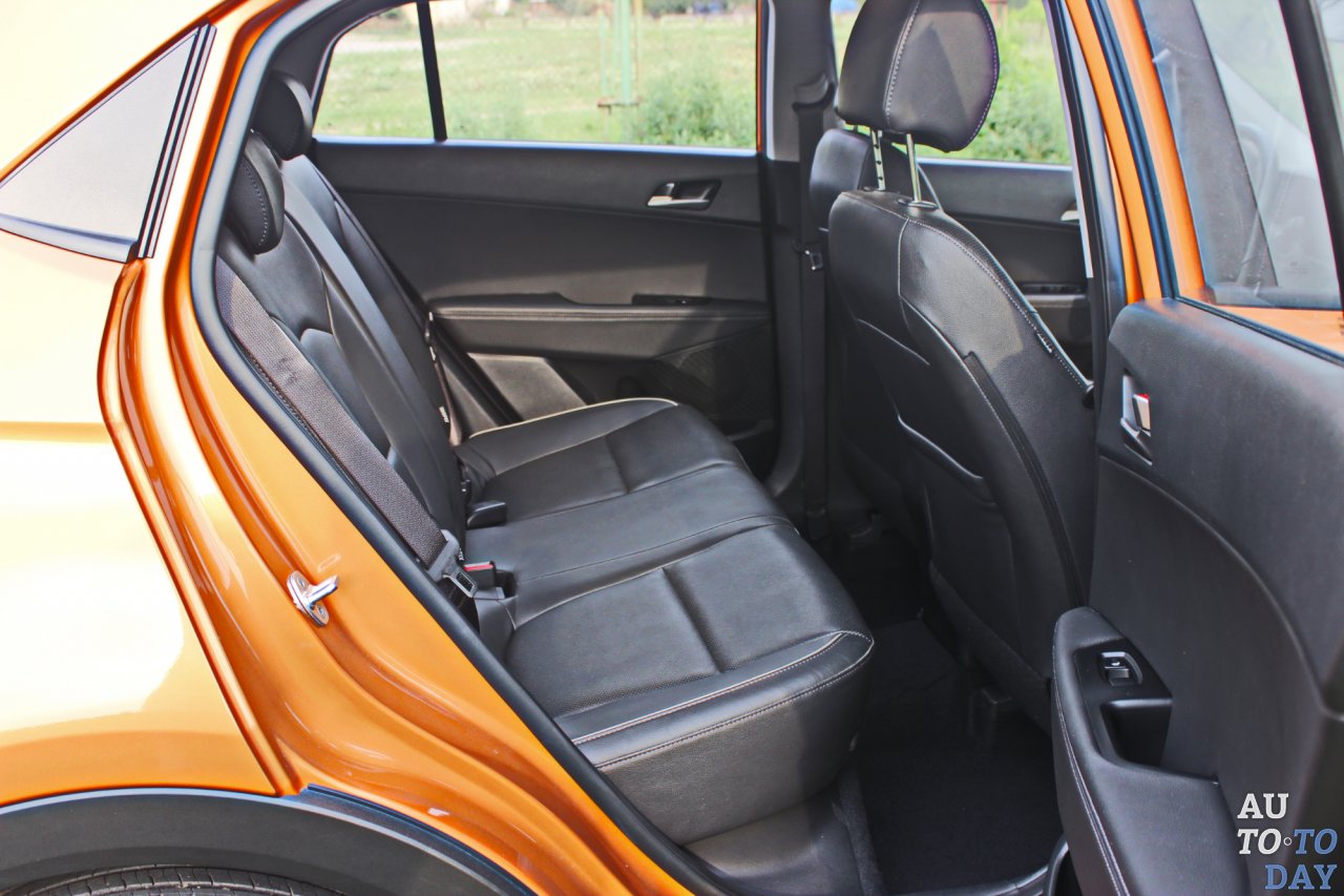 Рулевое колесо с классными приливами для классического хвата на «10» и «2» не только приятно на ощупь благодаря кожаной обшивке, но еще и удобно за счет рычажков-переключателей, отвечающих за музыку и меню бортового компьютера. Почти такие же мы пробовали на старшем кроссовере Tucson. За «баранкой» – лаконичный щиток приборов с почти квадратным цветным экраном. В общем, дизайн торпедо и дверных карт нельзя назвать претензионным, он скорее сдержан. Но при этом неплохо продуман функционально. Несмотря на преимущественно жесткие материалы отделки, все детали подогнаны плотно и ровно, и даже на самых злых неровностях не издают неприятных звуков. Правда, над шумоизоляцией нужно поработать, машина транслирует в салон почти все шумы дороги, которые поступают через колесные арки.