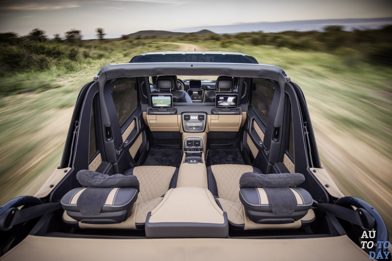 Последний выпуск Mercedes-Maybach G650 Landaulet отличается не только производительностью. Команда Maybach создала индивидуальный задний салон с двумя отдельными сиденьями, которые разделены центральной консолью с подстаканниками и выдвижными поддонами. Другие основные моменты включают в себя заднюю перегородку и двухэкранную развлекательную систему.