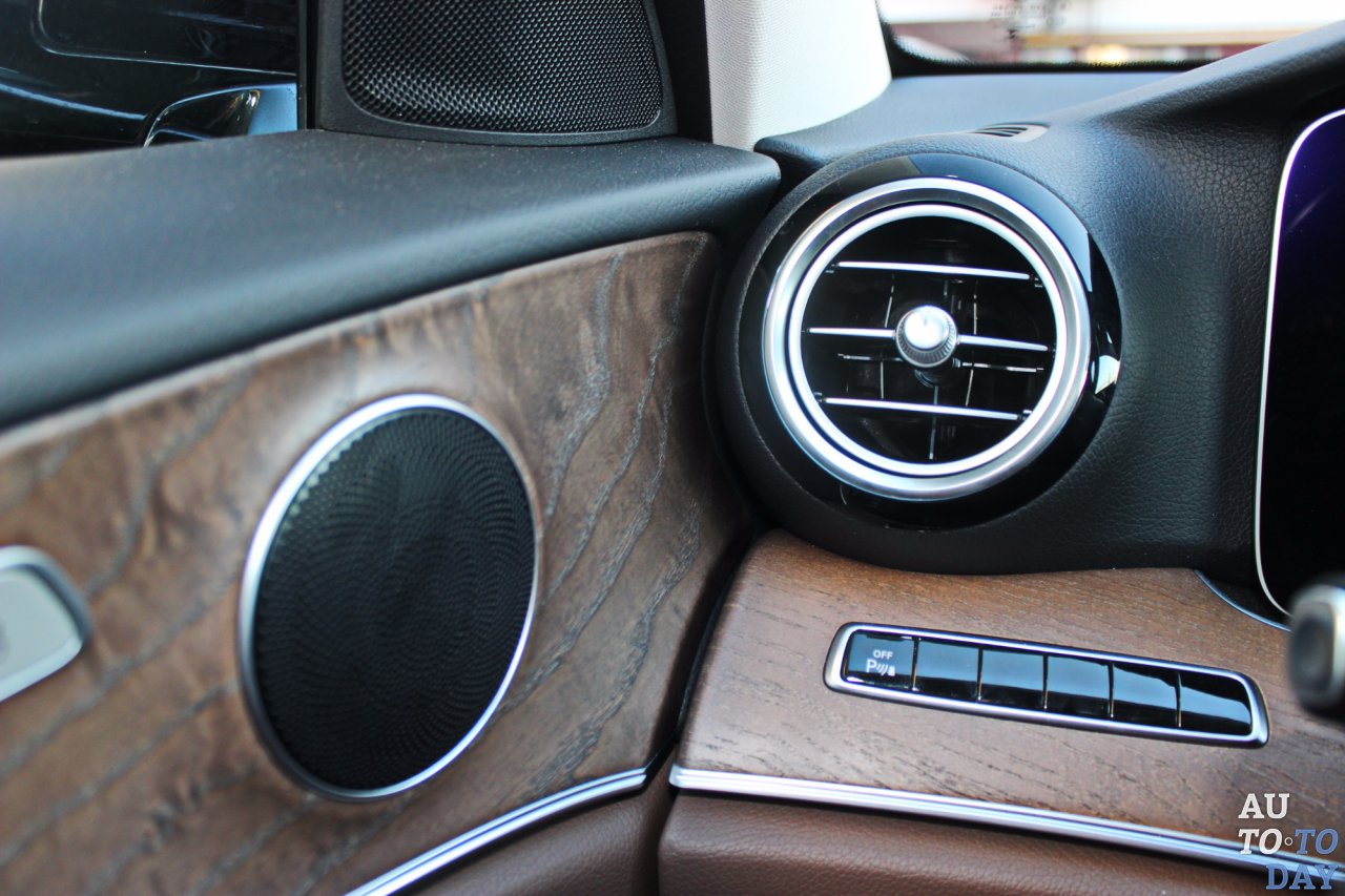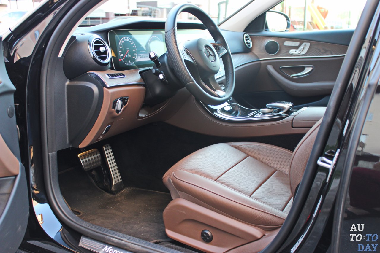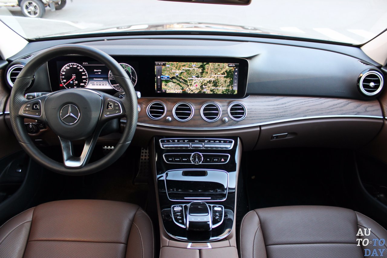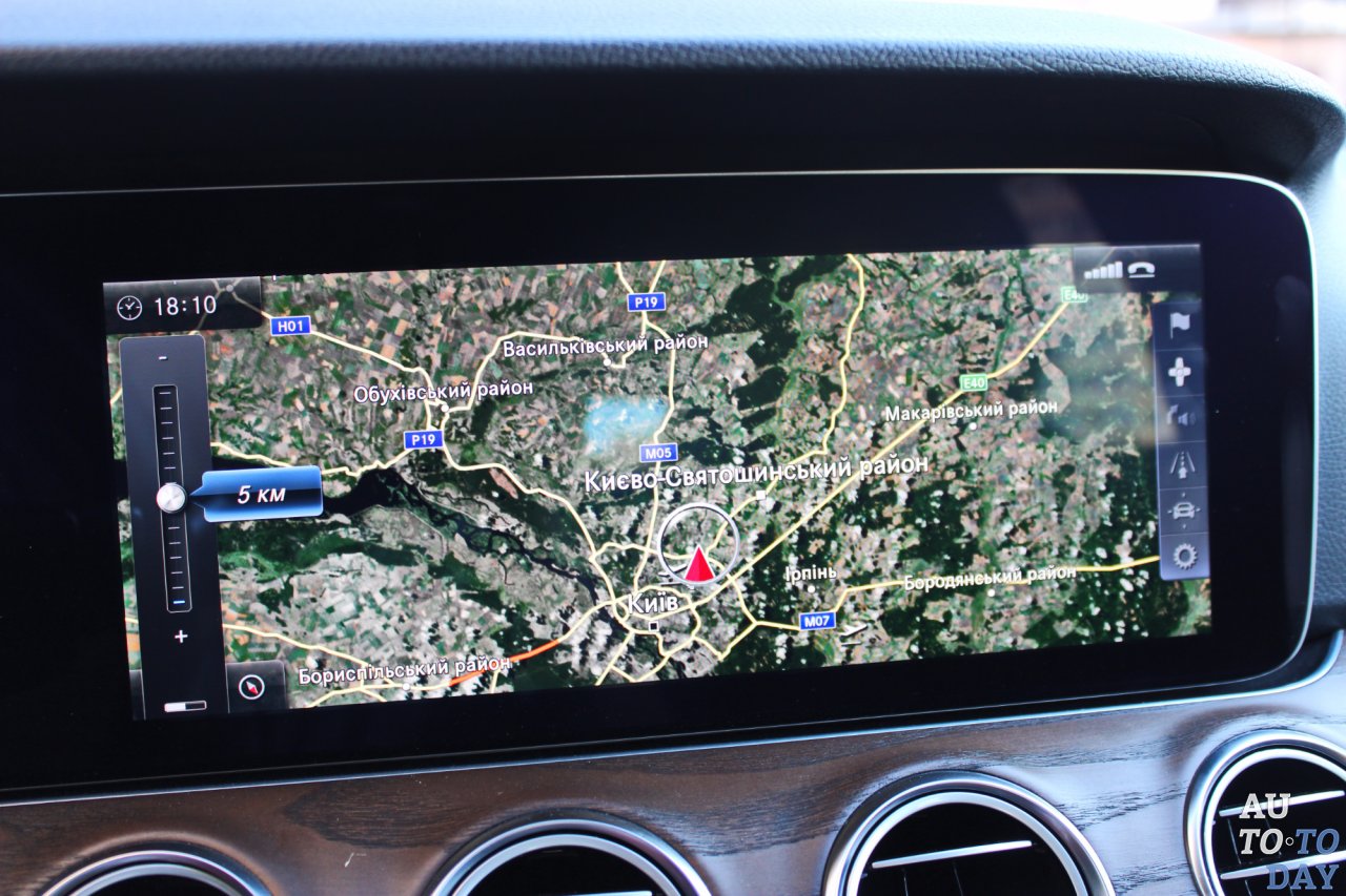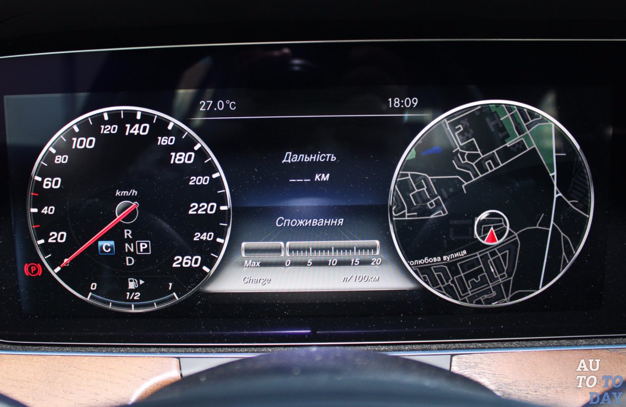 О качестве материалов и подгонке деталей салона также стоит говорить только в положительных тонах. Что на торпедо, что на дверных панелях и консолях преимущественно мягкие материалы, самым твердым мне показалось дерево, и никаких там пластиков разных пород. В нашей комплектации вместо щитка приборов – цветной дисплей, на правую часть которого можно вывести различную информацию, начиная от тахометра и заканчивая картинкой с навигации. Левая же часть со спидометром остается неизменной. Графика и реакция работы электронной «приборки», наверное, лучшая в классе. Почти встык к щитку установлен и второй дисплей, который отвечает уже за мультимедийную систему. Интереснее всего на экране смотреть масштабированную карту навигации и наслаждаться качественной картинкой с камер кругового обзора. E-Class стал одной из первых моделей марки, поддерживающих протоколы Apple CarPlay и Android Auto.