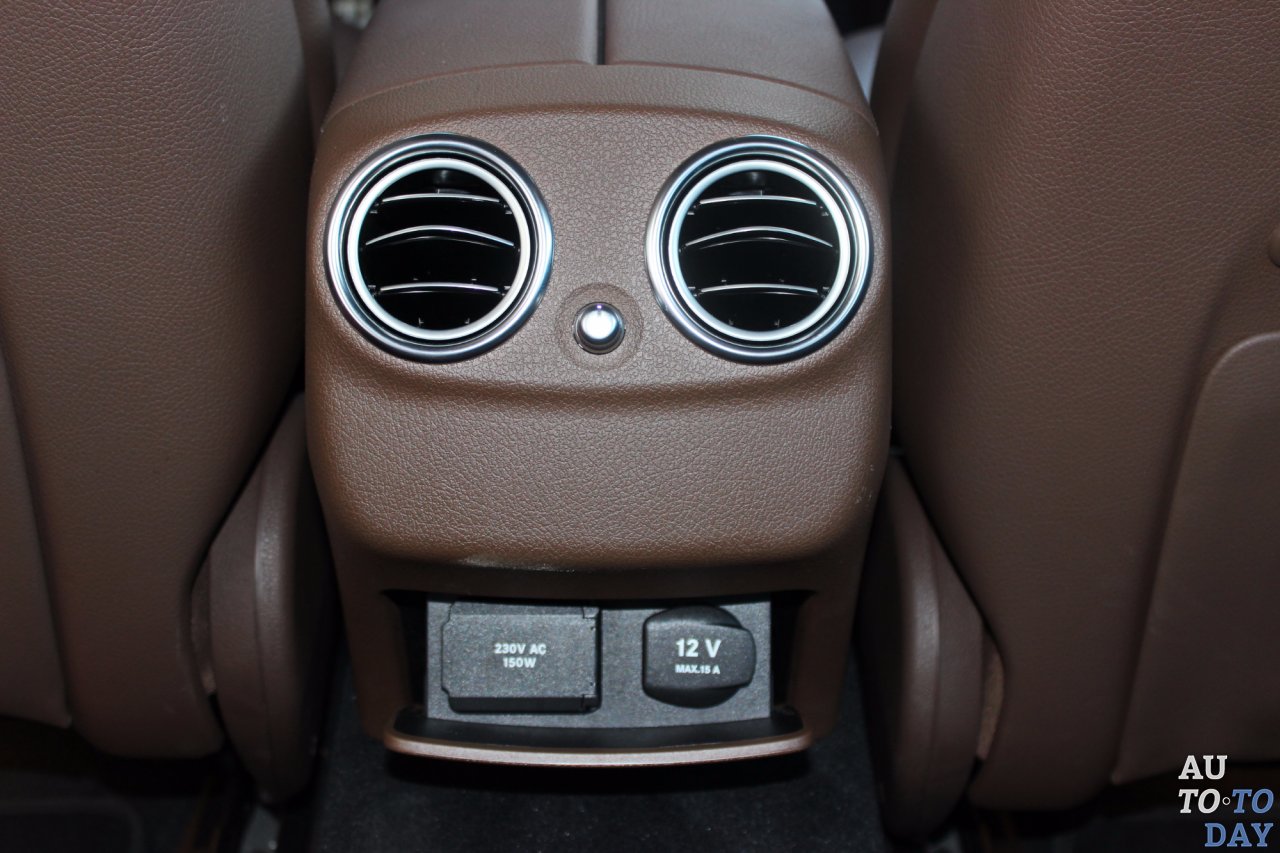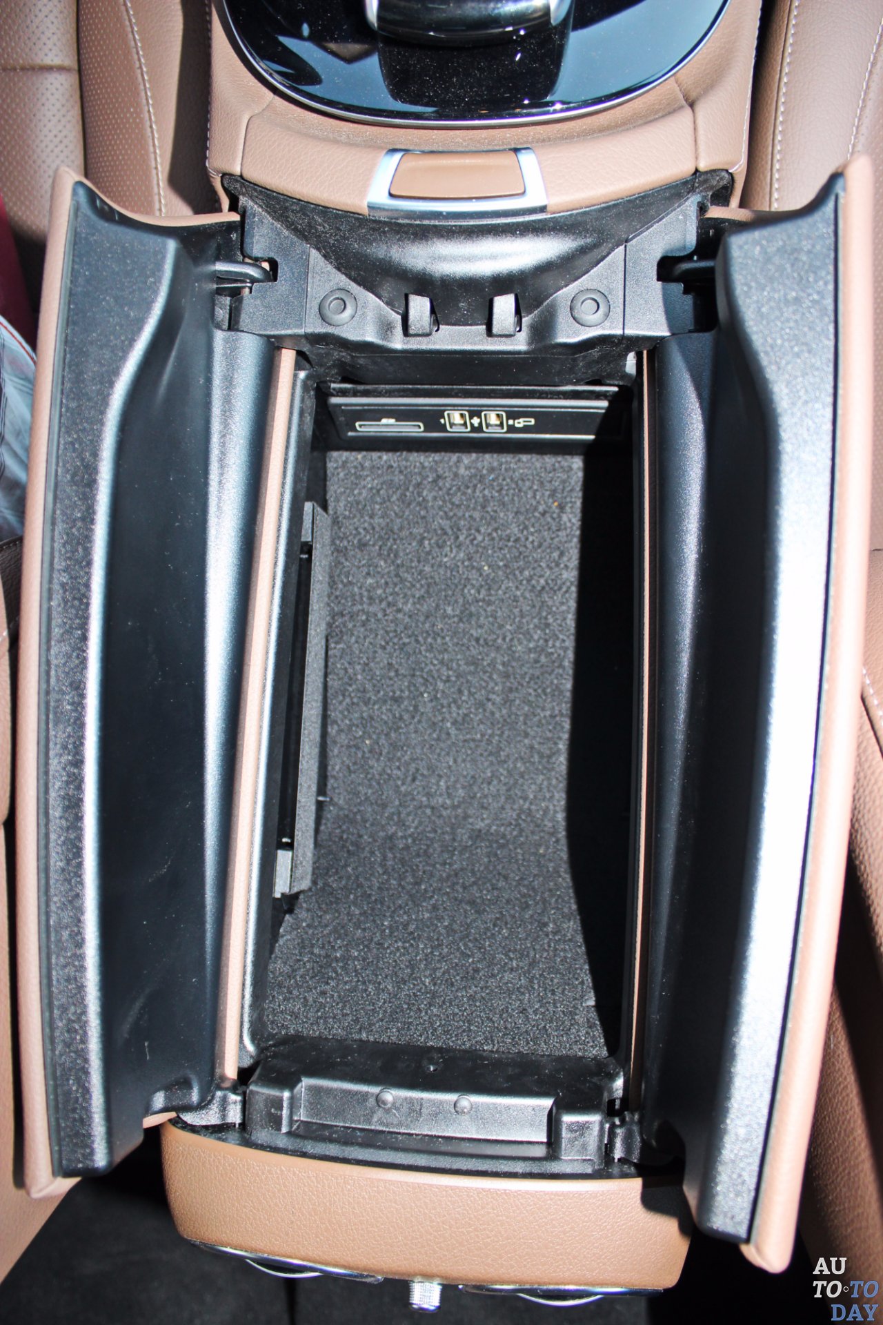 Вместительный подлокотник снабжен разъемами для зарядки и воздуховодами кондиционера.