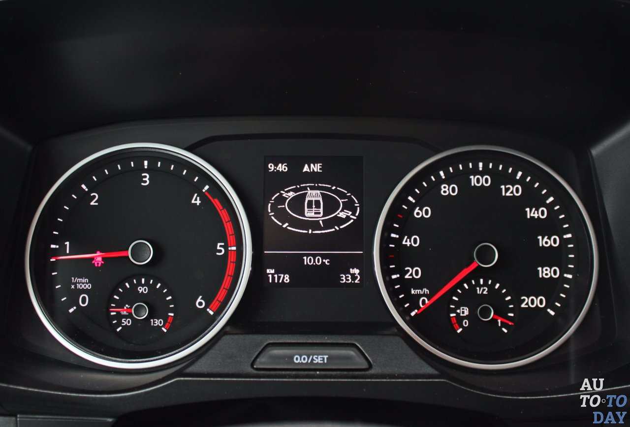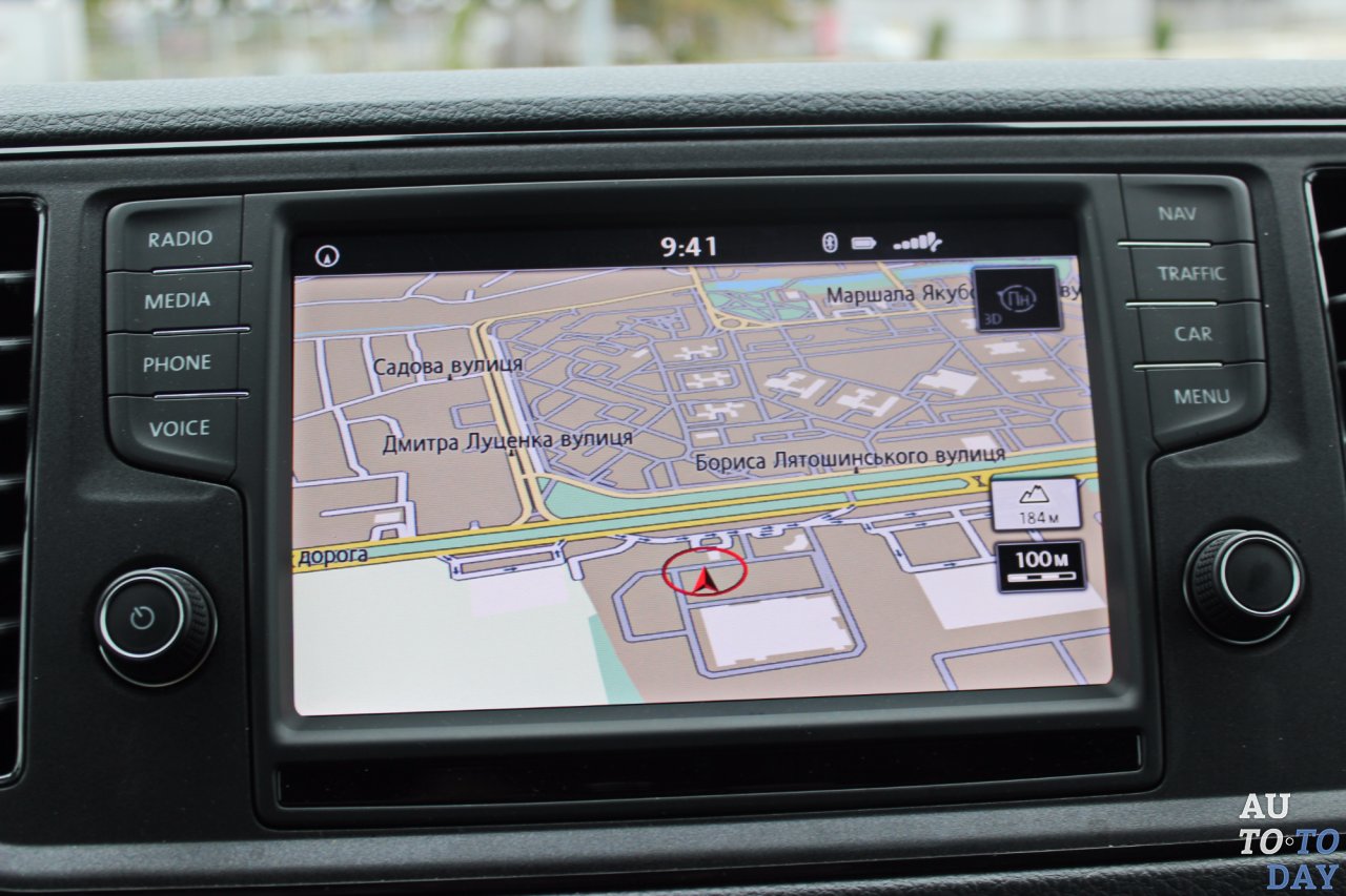 Удобный трехспицевый руль не отличить от меньших коммерческих автомобилей бренда – фургончика Caddy и пикапа Amarok. Кнопки на нем удобны, позволяют, не отрываясь от дороги, настраивать навигацию, совершать звонки и задавать скорость круиз-контролю. За рулевым колесом – аналоговый щиток приборов с двумя большими циферблатами и информативным черно-белым экраном, умеющим отлично прорисовывать маршрут, заданный в навигации. За мультимедиа и настройку автомобиля отвечает информационная система Composition Media с 8-дюймовым сенсорным экраном, возможностью голосового управления и даже беспроводной точкой доступа к интернету по Wi-Fi. Самое интересное, что выводится на большой монитор – это картинка с камеры заднего вида и кругового парктроника. Интересно, что сама камера находится на крыше фургона. Поначалу казалось, что такое решение спорно, оно сильно уменьшает картинку. Но зато с высоты намного лучше ощущать расстояние до препятствий и более точно и компактно парковаться.
