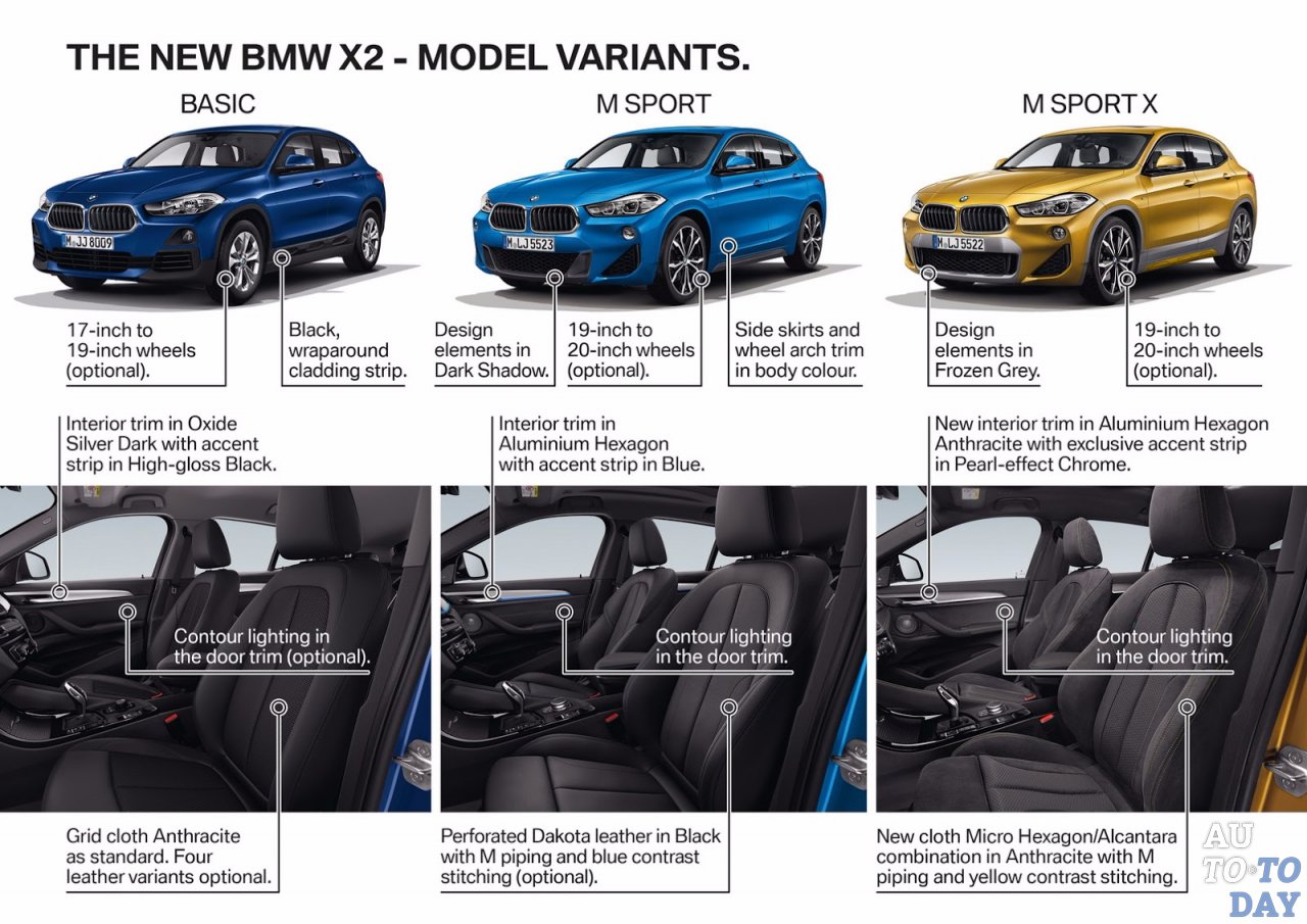 X2 может быть оснащен различными колесами в размерах от 17 до 20 дюймов. Как обычно, внешний вид кроссовера зависит от того, какая версия будет выбрана, поскольку базовые модели имеют черную облицовку и традиционный задний бампер, в то время как X2 M Sport окрашен в цвет Frozen Grey и оснащен более спортивным задним бампером.