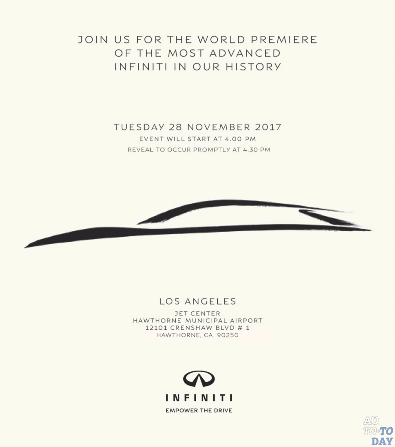 Говоря, что это «самый передовой Infiniti в нашей истории», автомобиль собирается дебютировать в Муниципальном аэропорту Хоторн в Южной Калифорнии во вторник, 28 ноября, в канун LA Auto Show.
