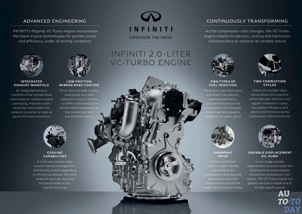 Благодаря технологии переменной компрессии двигатель может быть как мощным, так и экономичным. Infiniti не опубликовала подробные данные о топливной экономичности, но главный силовой инженер Nissan Синити Кига сказал, что новый QX50 будет иметь комбинированный рейтинг экономии топлива, который на 27 процентов выше, чем модель предшественница, которая оснащена 3,7-литровым двигателем V6, который развивает 325 л. с. мощности и 361 Нм крутящего момента. Двигатель будет подключен исключительно к бесступенчатой коробке передач.