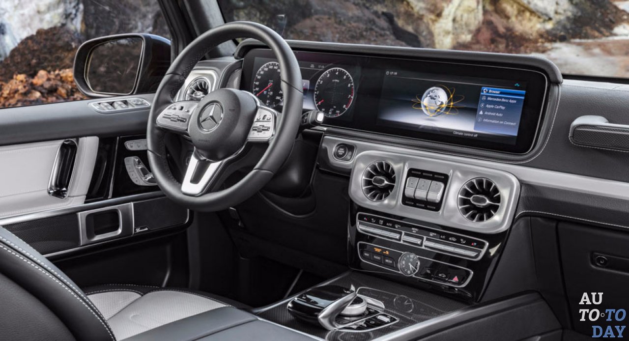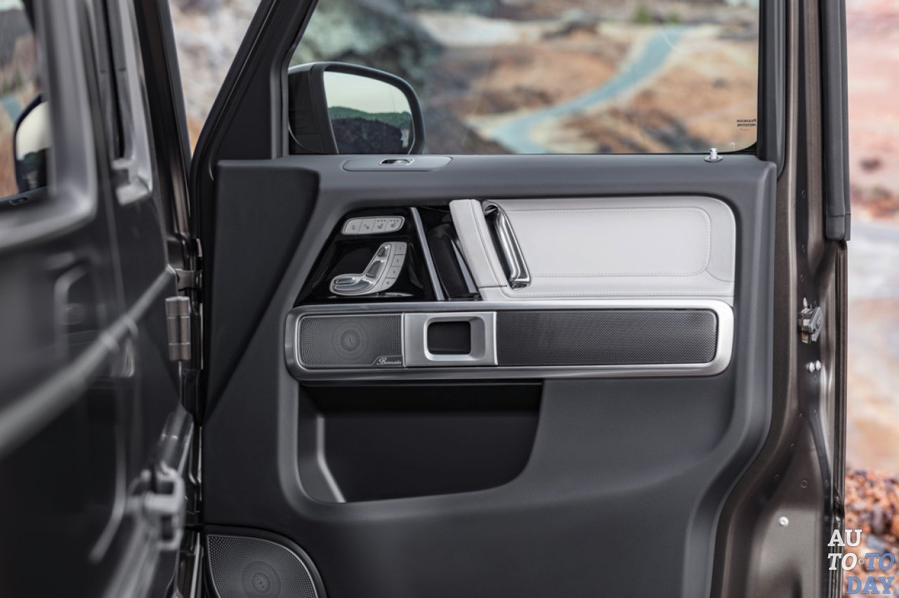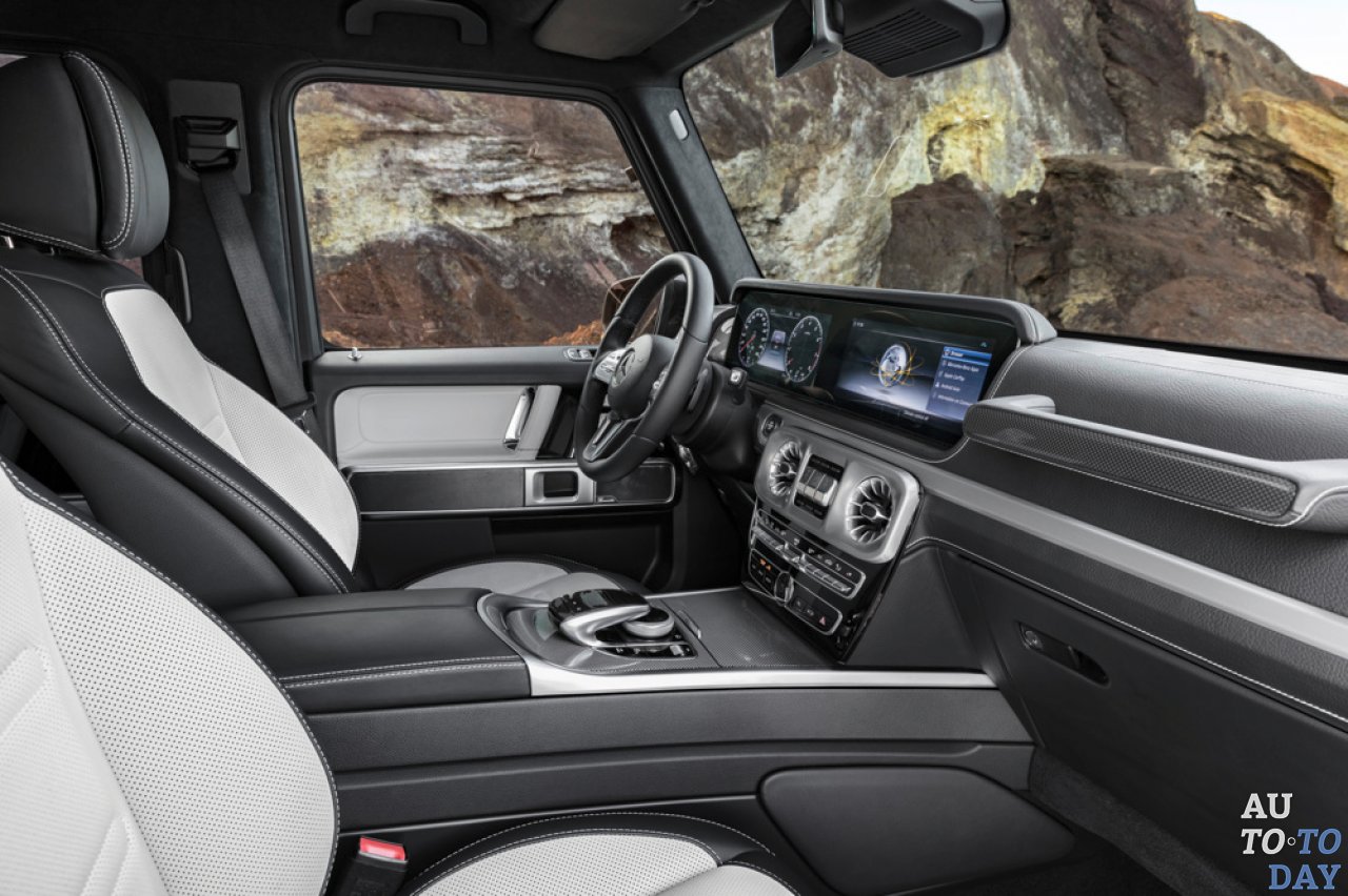 Салон автомобиля получит кожаную обивку и множество карбоновых, металлических и деревянных акцентов. Кроме дизайнерской отделки, здесь расположится 12,3-дюймовая информационно-развлекательная система, аналоговые датчики (в стандартной модели) и цифровые приборные панели с 12,3-дюймовым дисплеем в более продвинутых версиях. Также Mercedes-Benz G-Class будет иметь акустическую систему Burmester (на 16 динамиков) и специальную систему Active Multicontour Seat, что совместит в себе функции обогрева, вентиляции и массажа сидений. Без изменений останутся съемные держатели для стаканов или чашек и круглые вентиляционные отверстие, имитирующие фары SUV.