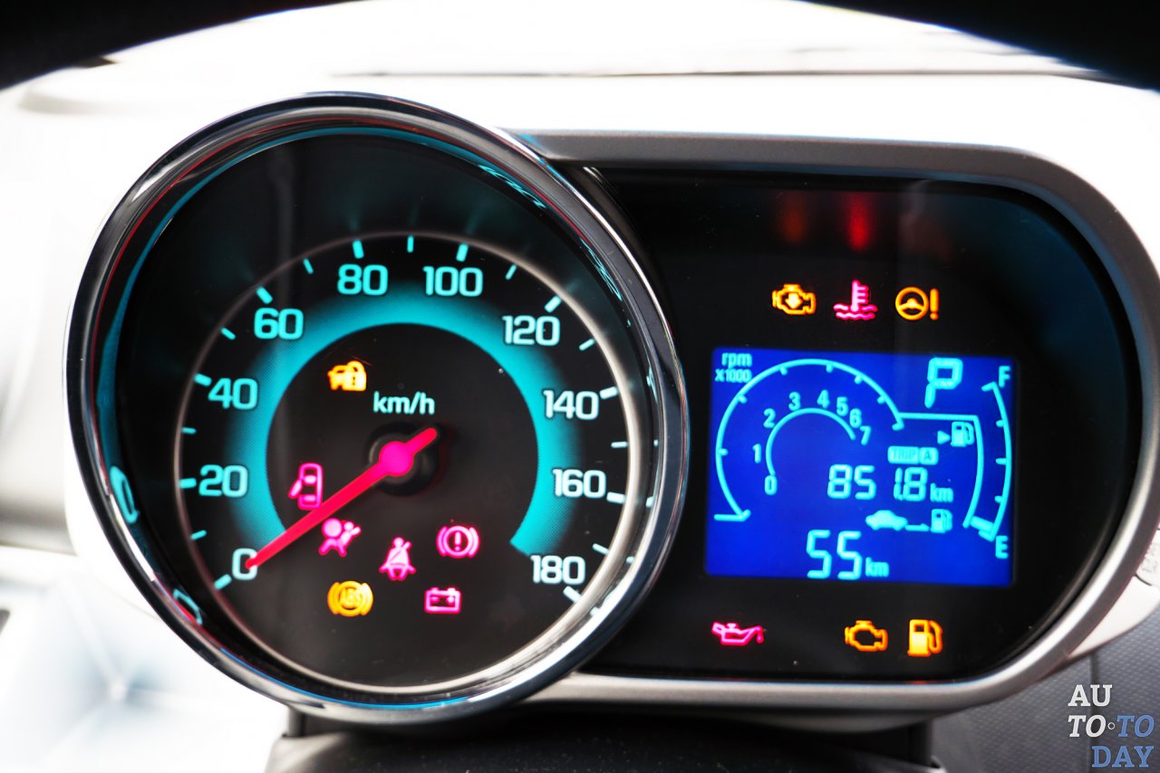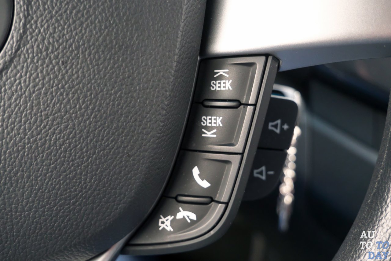 У нас на тесте мотоцикл о четырех колесах? Нет, но так может показаться, если взглянуть на щиток приборов с кислотно-синей подсветкой. В левой его части – аналоговый спидометр, а вот справа целая уйма циферок бортового компьютера, одометра и пр. Сказать по правде, правая часть в движении воспринимается не сразу, к мелким обозначениям нужно привыкнуть. Удобно, что щиток приборов закреплен на рулевой колонке и двигается вертикально вместе с рулем. Хорош по форме и сам руль: рельефный, с приливами. В левом нижнем секторе на рулевом колесе имеются кнопки управления мультимедиа и подключенным по Bluetooth телефону.