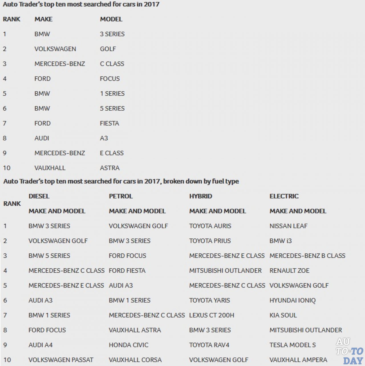 Дизельные поиски были увенчаны BMW 3-Series, Volkswagen Golf и BMW 5-Series, тогда как наиболее популярными бензиновыми автомобилями были Volkswagen Golf, BMW 3-Series и Ford Focus.