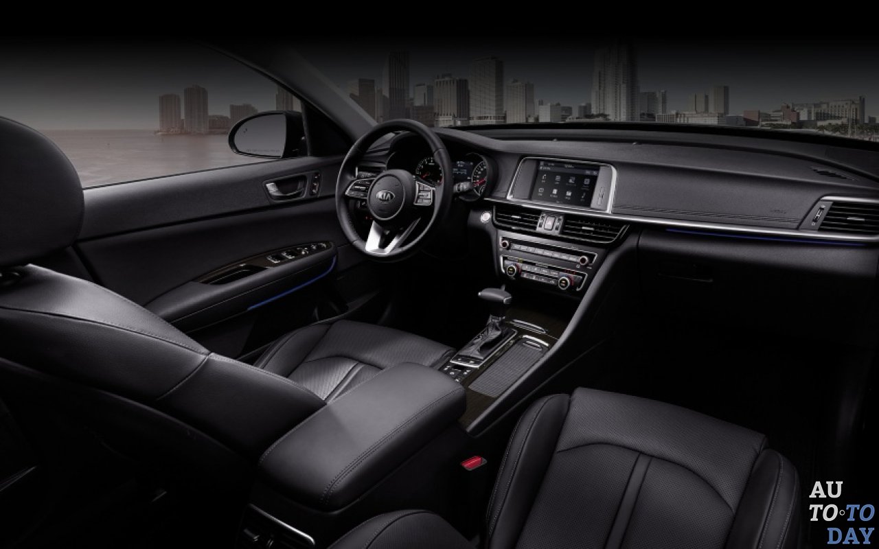 Внутри представленная Optima сохранила привычную компоновку приборной панели, но получила модернизированную информационно-развлекательную систему с сенсорным дисплеем и функцией распознавания голоса, а также усовершенствованное рулевое колесо с современным дизайном. В список дополнительного оборудования вошли адаптивный круиз-контроль, аудиосистема Krell, обогрев сидений, двухзонный климат-контроль, камера заднего вида и ассистент движения по автостраде.