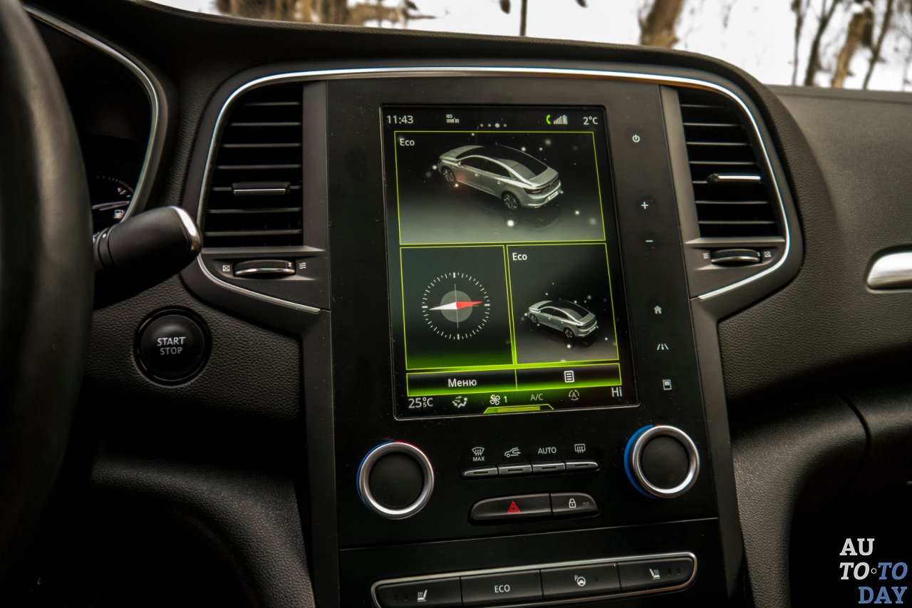 Но что же вместо кнопок? В седане, как и в хэтчбеке Megane, с которым мы знакомились ранее, все сходится на вертикальном 8,7-дюймовом дисплее мультимедийной системы R-Link 2. Тут и настройки климата, и навигация, и музыка, и все-все-все. В городе настраивать машину несколькими кликами, или свайпами удобно. Но некоторые сложности возникают на трассе. На большой скорости для регулировки интенсивности обдува и его направления нужно отрываться от дороги. К этому нужно привыкать, а лучше выставлять нужные регулировки заблаговременно.