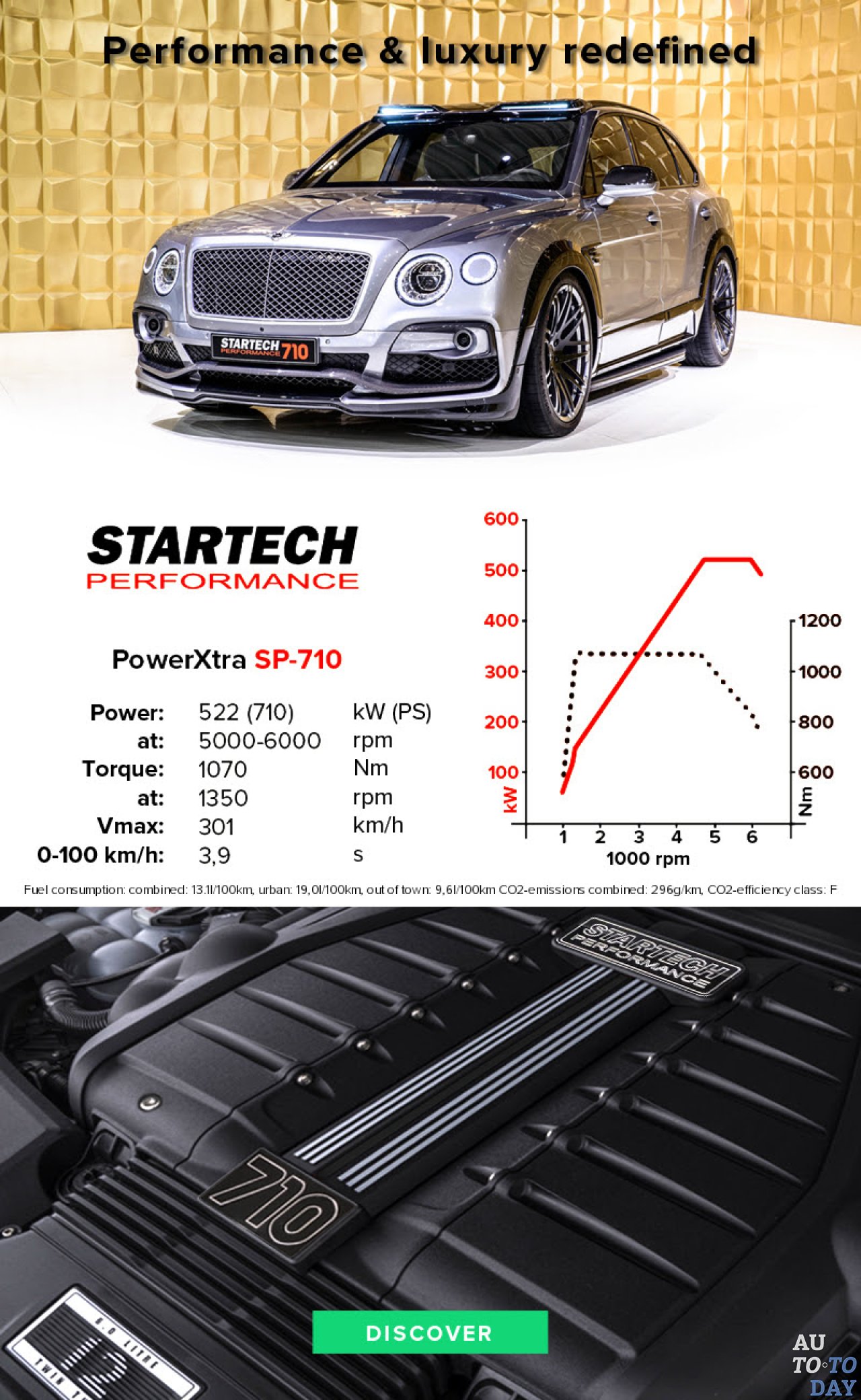 Большинство владельцев Bentley Bentayga считают, что производительности от 6,0-литрового двигателя W12, выдающего 608 лошадиных сил и 900 Нм крутящего момента, вполне достаточно. Тем не менее, есть и небольшая часть водителей, которая хочет получить немного больше. Специально для них известное тюнинг-ателье Startech реализовало внушительные изменения, что поднимают стоимость автомобиля на целых 18 900 евро (по текущему курсу эквивалентно 23 391 доллара), а это равняется нынешней стоимости нового Volkswagen Golf.