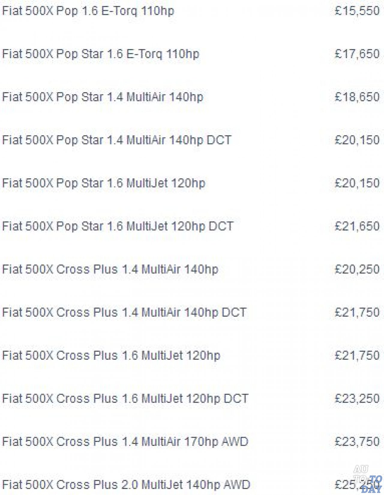 Линейка двигателей будет состоять из 1,6-литрового E-Torq, выдающего 110 лошадиных сил, 1,4-литрового MultiAir (140 лошадиных сил), 1,6-литрового MultiJet (120 лошадиных сил), 1,4-литрового MultiAir (170 лошадиных сил) и 2,0-литрового MultiJet (140 лошадиных сил). Стоимость самой дешевой Fiat 500X в Европе будет стартовать от 15 550 фунтов стерлингов, при этом специальная модель Mirror получит цену в 18 250 фунтов стерлингов.