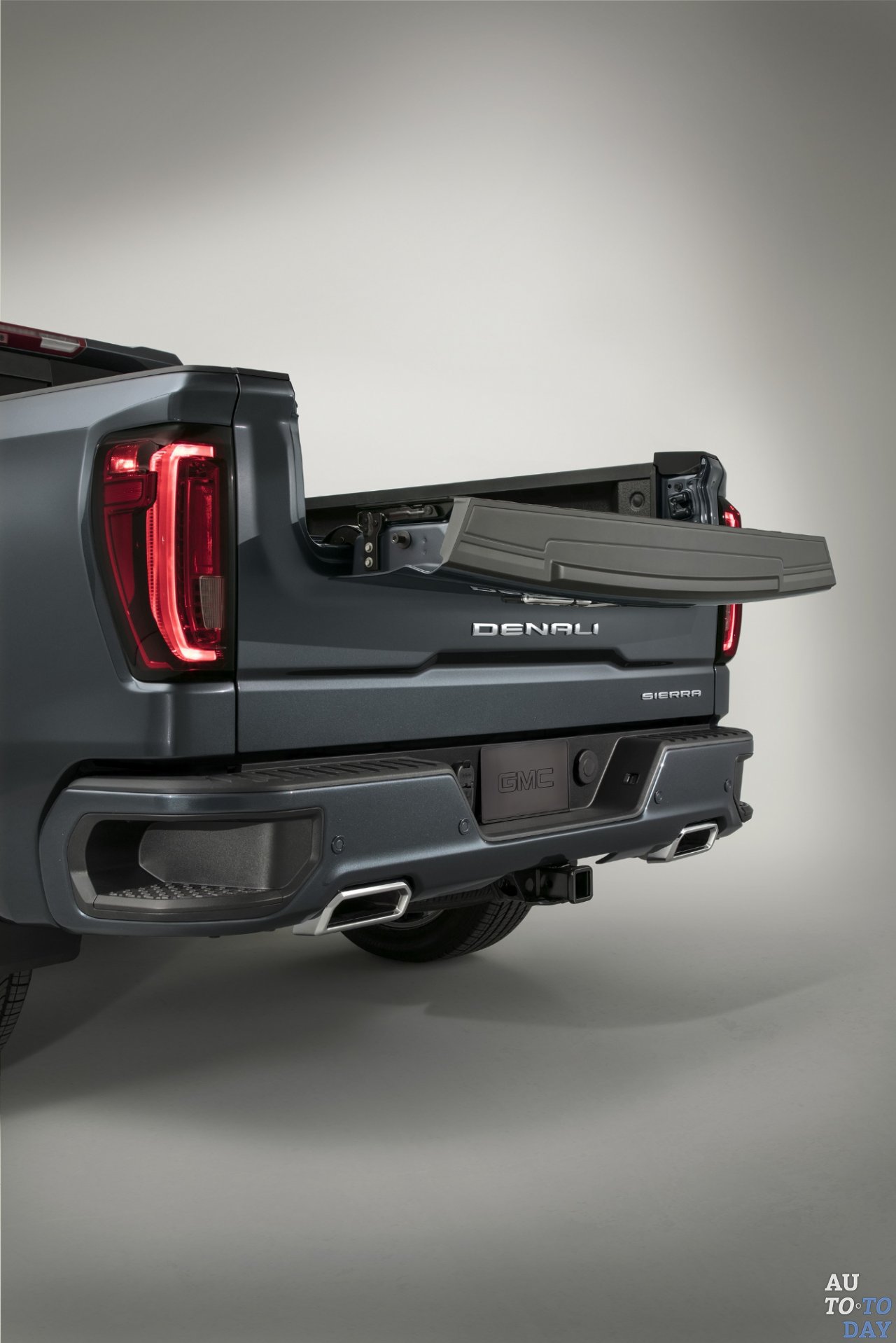 В первую очередь более дорогая версия Silverado получает достаточно широкую решетку радиатора, окруженную фарами, стильный кузов, переработанный грузовой отсек, который стал значительно вместительнее, а также целый ассортимент колес размером до 22 дюймов. Помимо этого, автомобиль получает два нововведения. Первый из них – задний борт MultiPro Tailgate, который является стандартным для комплектаций Denali и SLT, предоставляющий «шесть уникальных функций и положений», включая облегчённый доступ к грузам, лежащим сверху и режим лестницы. Таки образом он выдерживает нагрузку до 170 килограмм. Второй – грузовой отсек CarbonPro, доступный исключительно в качестве опции для Denali.
