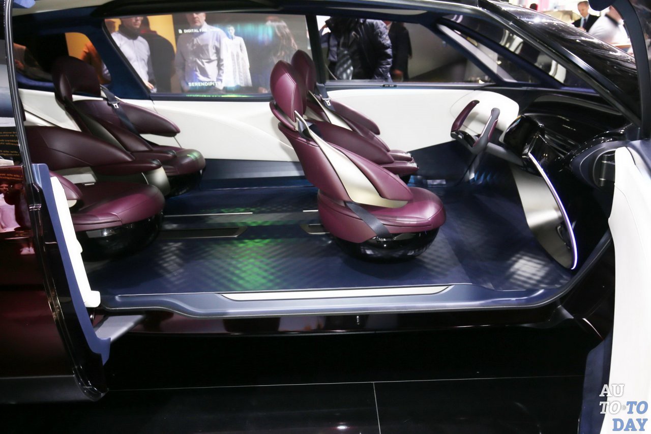 Дебютировавший автомобиль, который больше напоминает автономную гостиную на колесах, а не что-то более традиционное, имеет привычное рулевое колесо (в отличии от VW I.D. Vizzion или Renault EZ-GO). В основе шестиместной новинки, работающей на топливных элементах, лежат электрические двигатели, а также настраиваемая кабина с неподвижными задними сиденьями и четырьмя креслами, которые можно перемещать по салону. Чтобы взаимодействовать с транспортным средством, пассажиры будут использовать различные дисплеи с сенсорным экраном, в то время как человек, находящийся за рулем, получит доступ к дисплею на рулевом колесе (механические переключатели отсутствуют).
