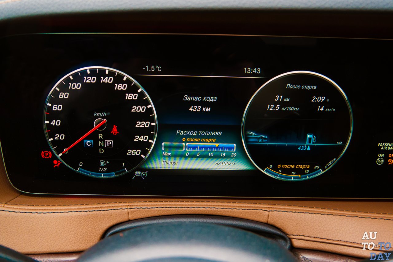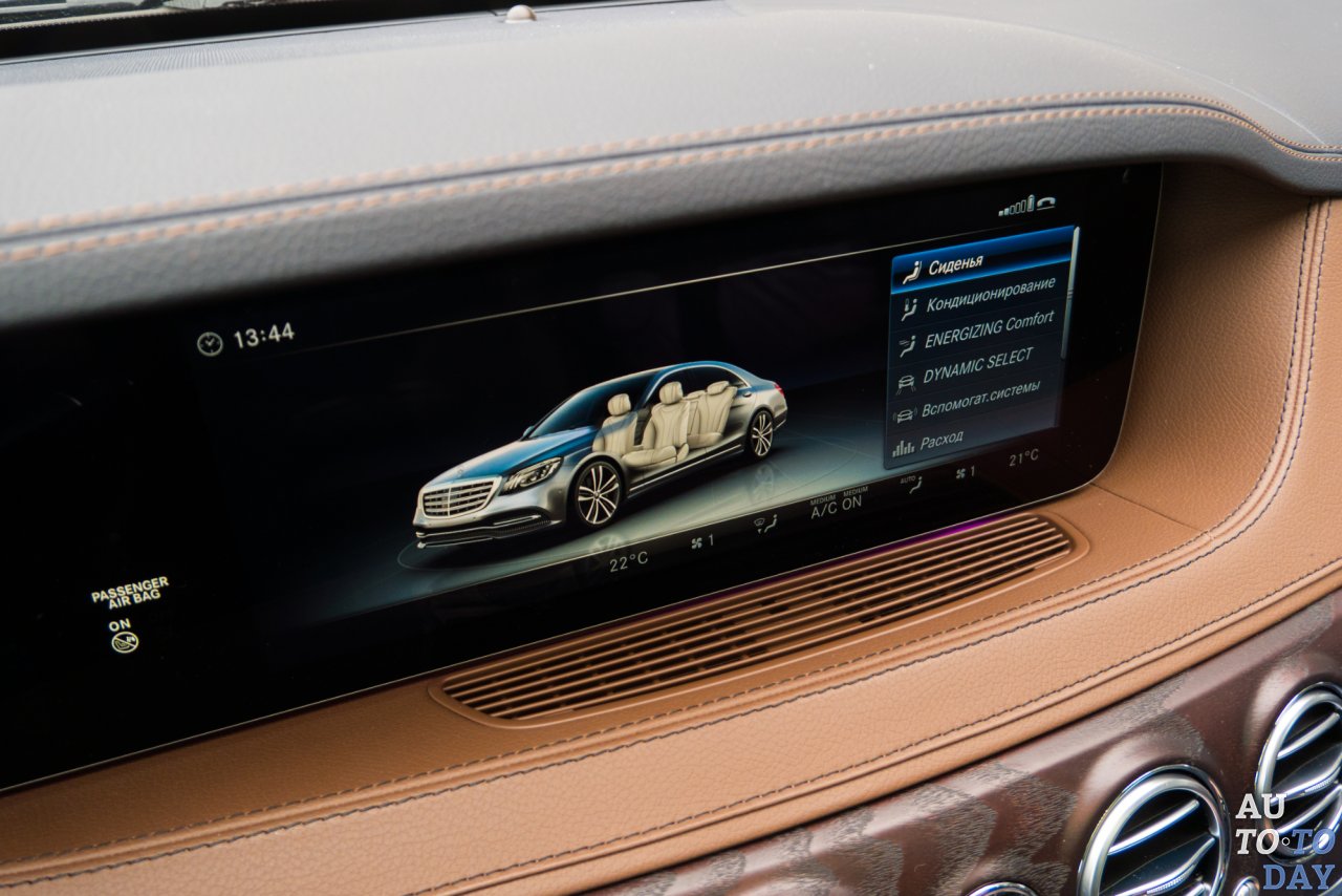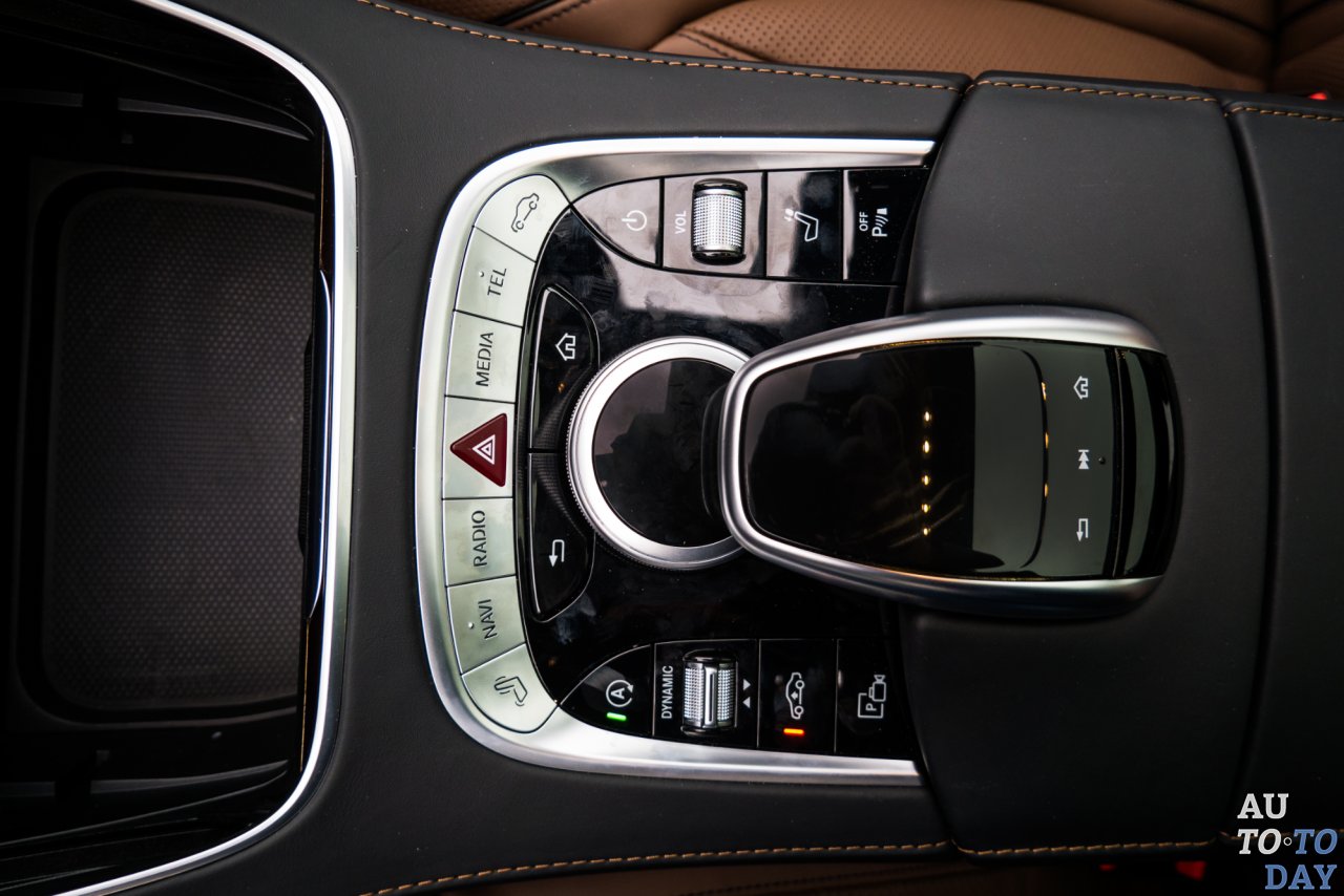 Рычажок фирменного круиз-контроля, который появился еще на прапрапрадедушке W116, в рестайлинговой версии W222 исчез, управление полностью отдано кнопкам на руле. На лобовое стекло проецируется широкий перечень данных, от скорости до подсказок навигации. Но если этот хэд-ап дисплей не ваша любимая опция, его всегда можно отключить. На центральном тоннеле появилась тач-панель управления мультимедиа, как и на других авто бренда.