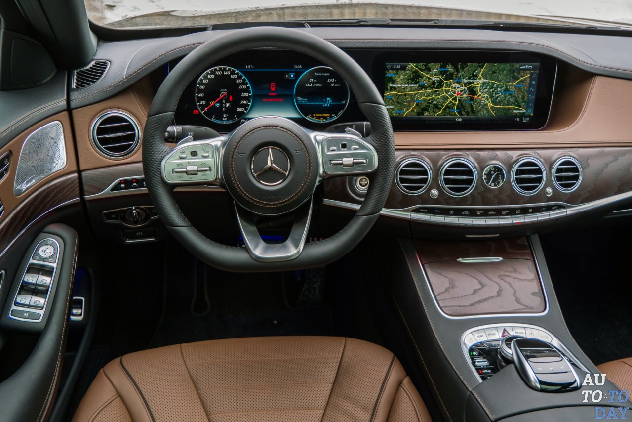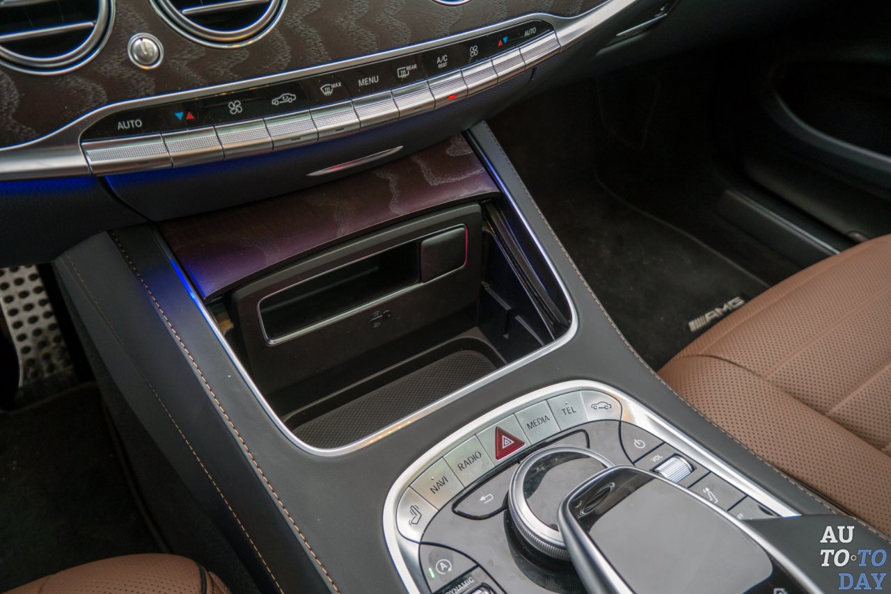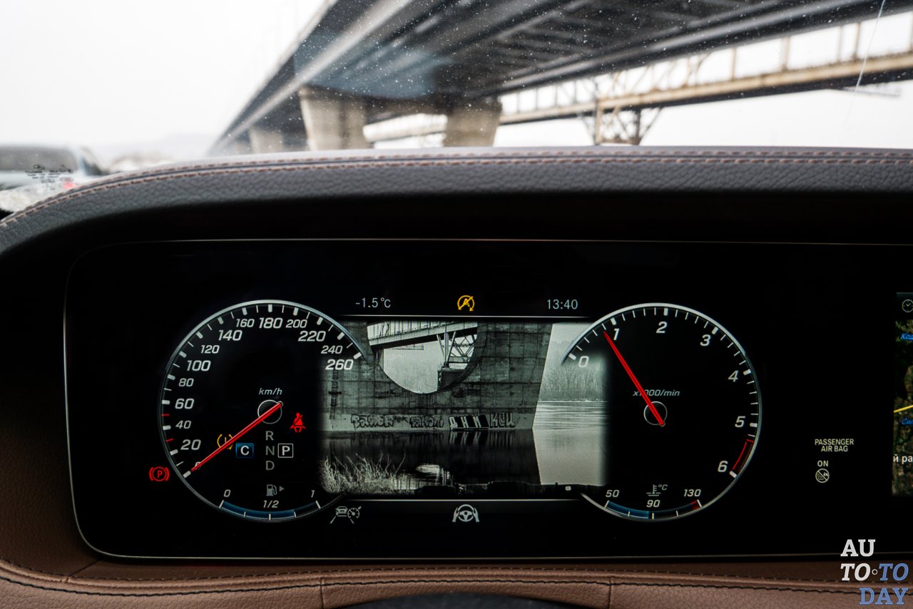 Рычажок фирменного круиз-контроля, который появился еще на прапрапрадедушке W116, в рестайлинговой версии W222 исчез, управление полностью отдано кнопкам на руле. На лобовое стекло проецируется широкий перечень данных, от скорости до подсказок навигации. Но если этот хэд-ап дисплей не ваша любимая опция, его всегда можно отключить. На центральном тоннеле появилась тач-панель управления мультимедиа, как и на других авто бренда.