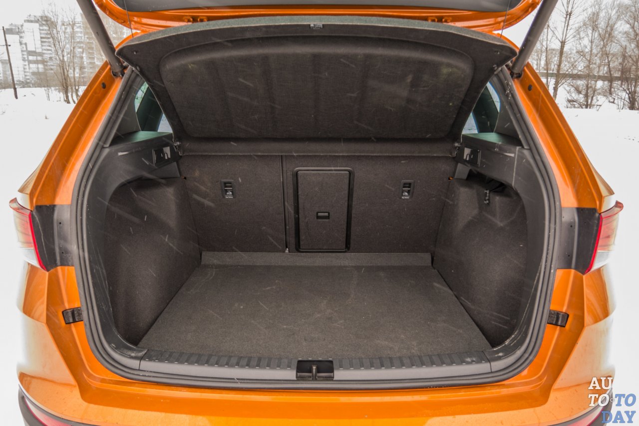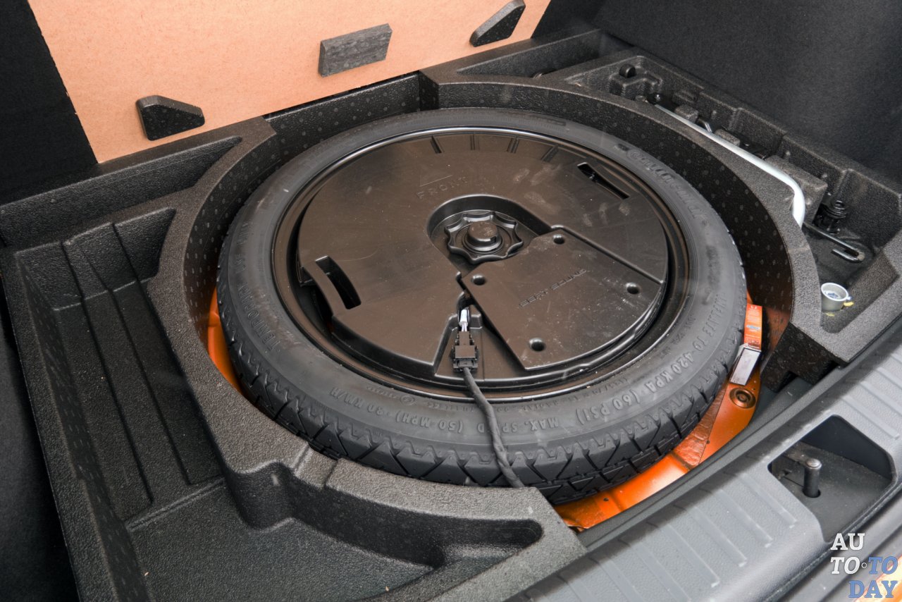 На галерке места достаточно, не много и не мало. У сидящих сзади по бокам подушки тоже обиты замшей, по центру же – ткань. Сзади можно ездить и втроем, но сидящему в центре может мешать трансмиссионный тоннель. Если нужно перевезти лыжи или борд, на помощь придет лючок для длинномеров в спинке второго ряда, соединяющий салон с багажником. Сам же багажный отсек имеет объем 485 литров, а со сложенными спинками второго ряда увеличивается до 1604 л. Здорово, что после такой трансформации получается ровный пол. Под последним, кстати, спрятано временное запасное колесо, в центре которого уместился сабвуфер.