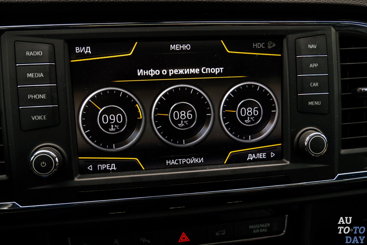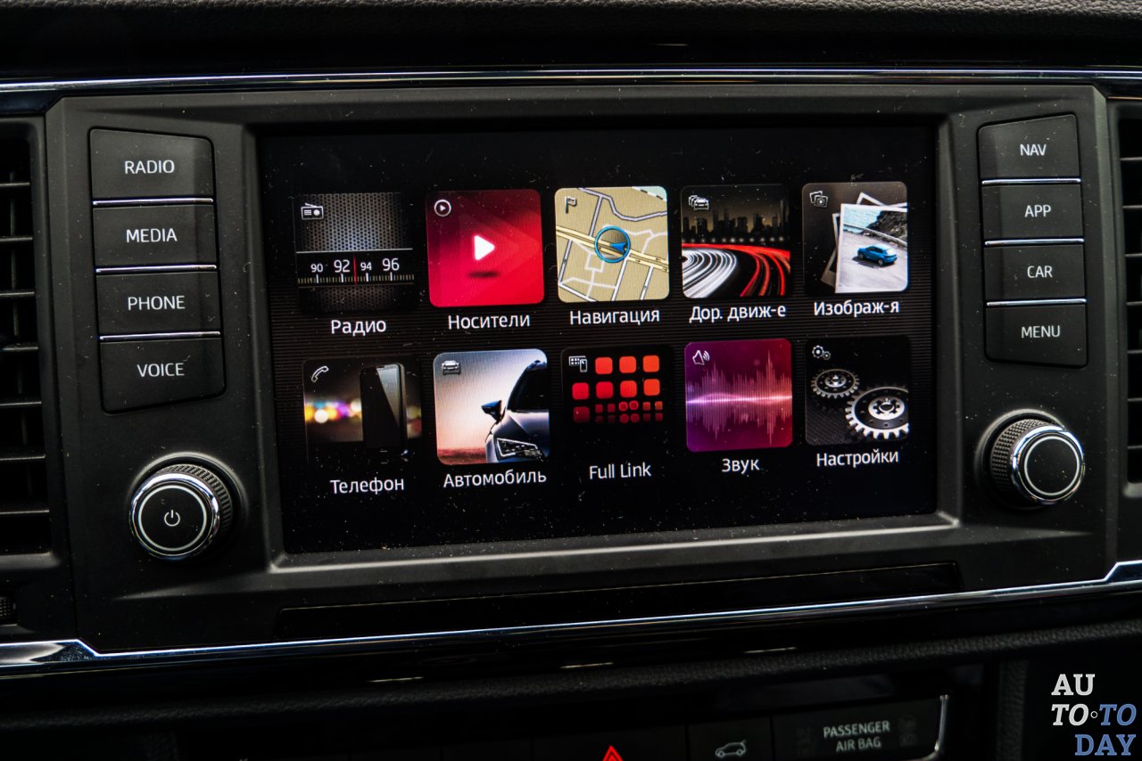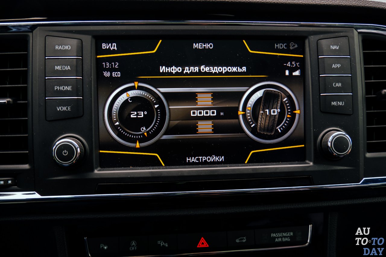 Центральная панель общей архитектурой блока «климата» и комбинацией клавиш схожа с другими моделями концерна. А вот форма клавиш – своя, «сеатовская». 8-дюймовый экран мультимедийной системы главным меню напоминает фаблет с большими ярлыками иконок. Пользоваться им даже на ходу удобно. При желании на дисплей можно вывести внедорожную информацию с углами поворота колес и кренов кузова. Еще один пакет информации – спортивный, с температурой масла, охлаждающей жидкости и другими параметрами. У системы традиционно для мультимедиа VAG налажена крепкая дружба со смартфонами через протоколы Apple CarPlay и Android Auto.