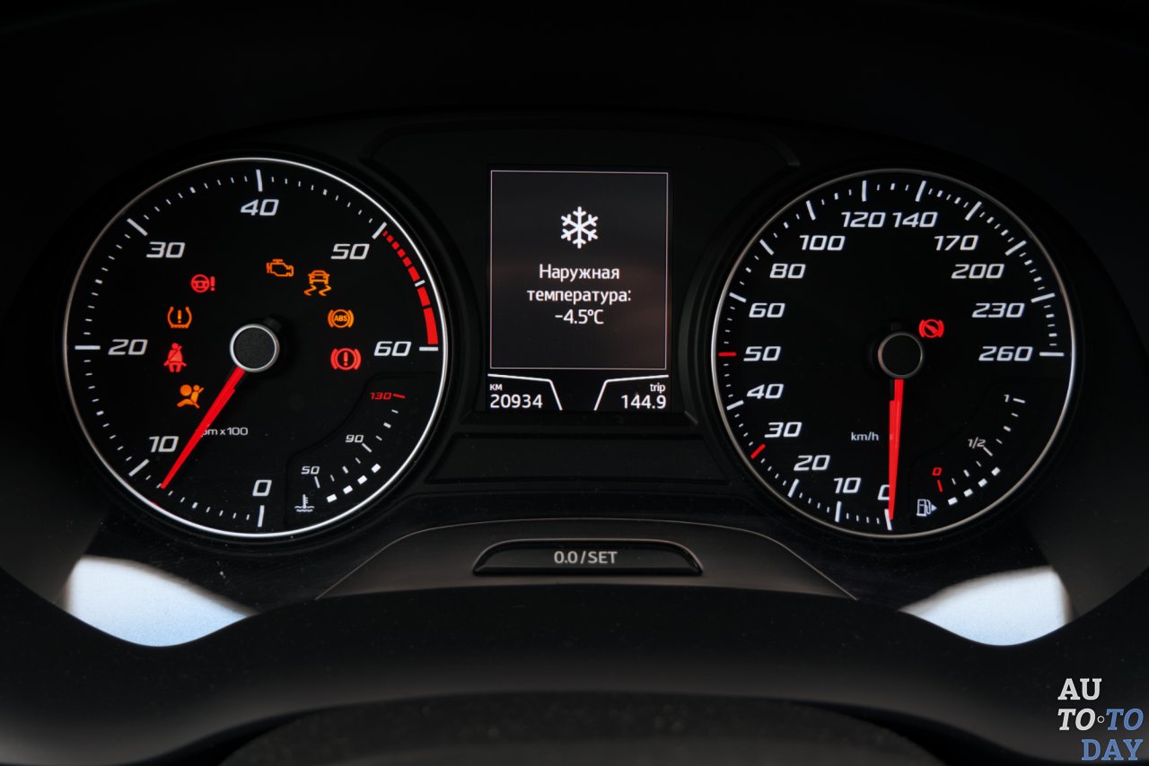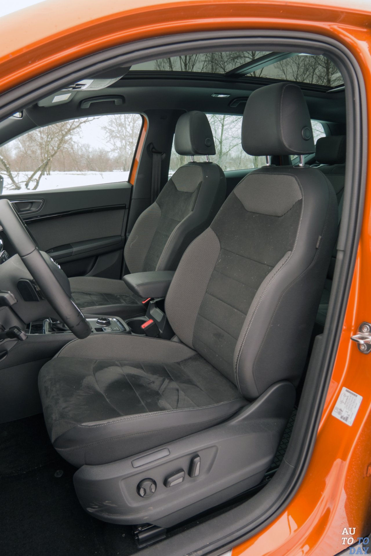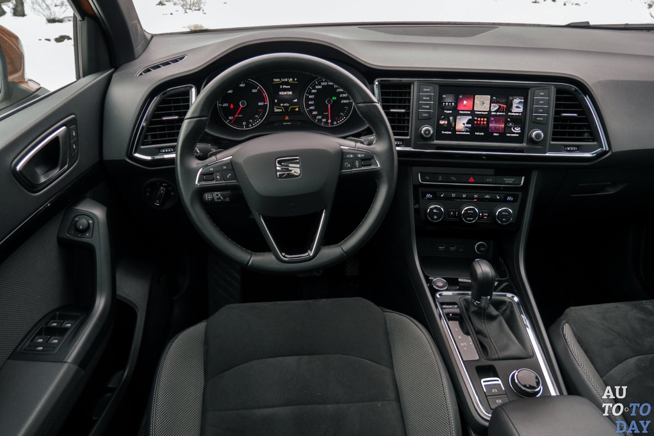 Центральная панель общей архитектурой блока «климата» и комбинацией клавиш схожа с другими моделями концерна. А вот форма клавиш – своя, «сеатовская». 8-дюймовый экран мультимедийной системы главным меню напоминает фаблет с большими ярлыками иконок. Пользоваться им даже на ходу удобно. При желании на дисплей можно вывести внедорожную информацию с углами поворота колес и кренов кузова. Еще один пакет информации – спортивный, с температурой масла, охлаждающей жидкости и другими параметрами. У системы традиционно для мультимедиа VAG налажена крепкая дружба со смартфонами через протоколы Apple CarPlay и Android Auto.