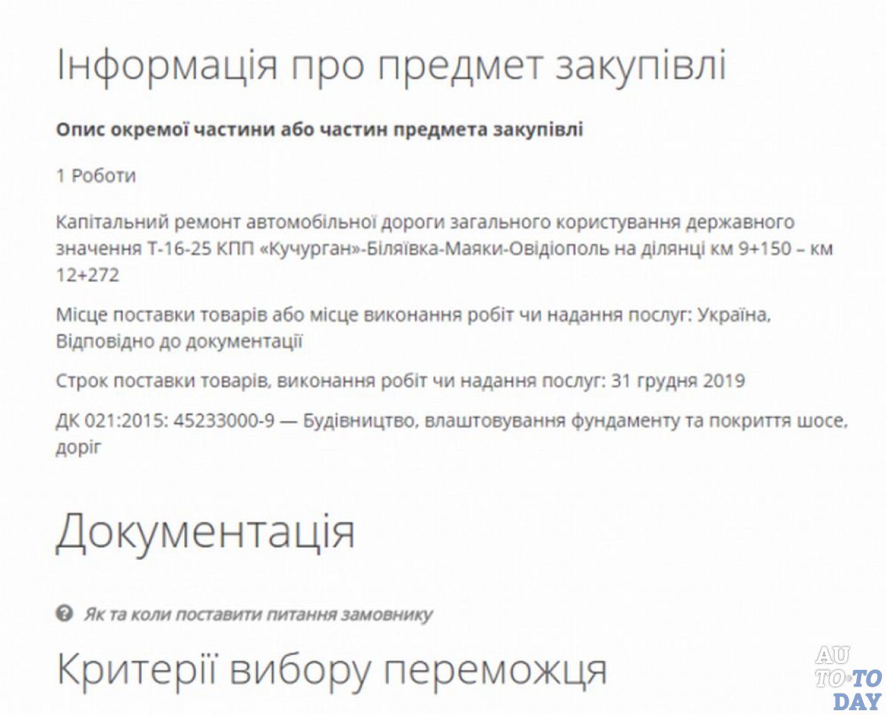 На сайте системы публичных закупок «ProZorro» появилось объявление о проведении открытого аукциона среди подрядчиков, которые занимаются строительством и ремонтом дорог. Его разместила Служба автомобильных дорог в Одесской области. Победитель торгов получит право отремонтировать трассу Т-16-25 КПП (Кучурган-Беляевка-Маяки-Овидиополь), находящуюся в этом регионе.