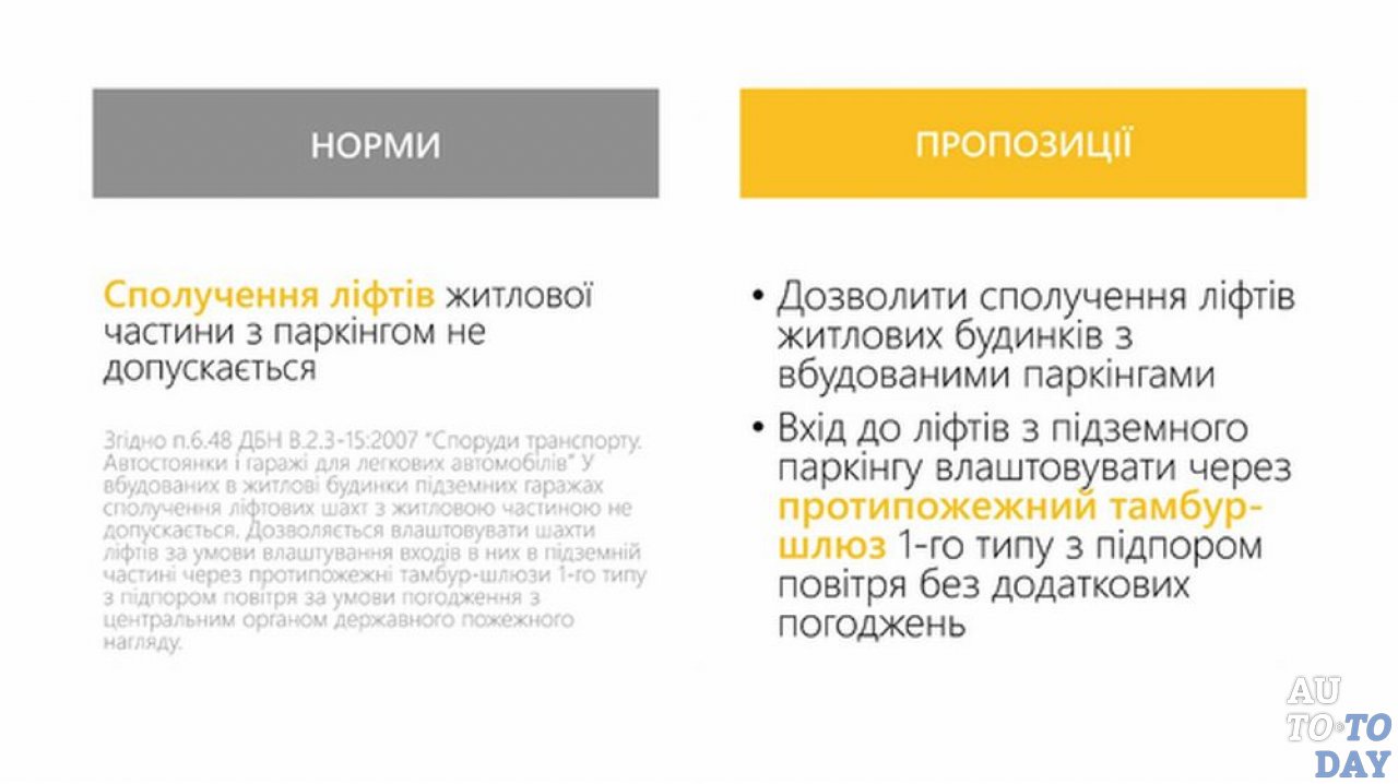 В пункте 6.43 правил ГСН В.2.3-15:2007 говорится, что все этажи или секции подземного паркинга должны содержать не менее двух рассредоточенных выездов и эвакуационных выходов. Предложено для подземных стоянок, вмещающих более ста паркомест, применять требования как к обычным подземным паркингам. Как объясняют инициаторы предложения, действующая сейчас норма содержит требования из расчета, что при возникновении пожара жильцы начнут массово эвакуировать свои транспортные средства. «Спасение автомобилей во время пожара — нецелесообразно и опасно» — написано в разъяснении к предложенным нормам.