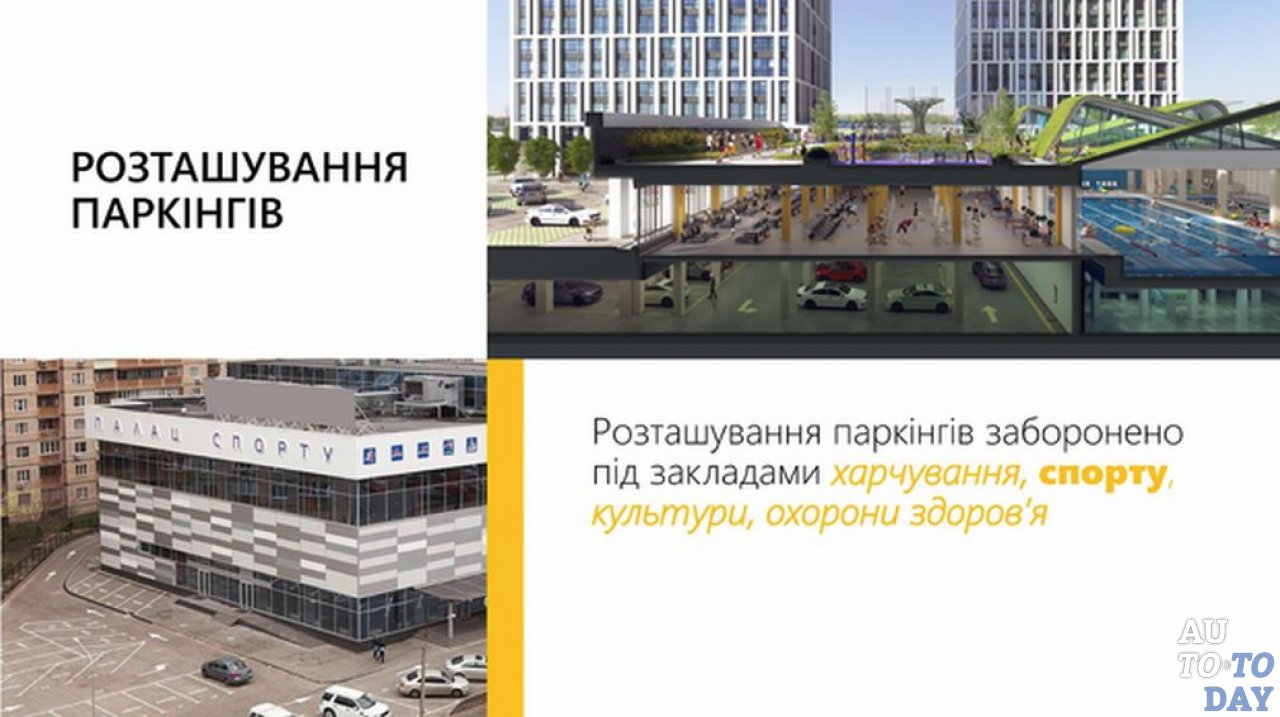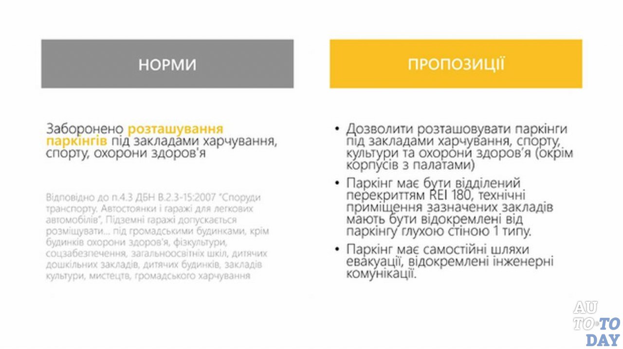 Пункт 4.3 правил ГСН В.2.3-15:2007 гласит, что подземные гаражи можно строить только под зданиями общественного значения, кроме общеобразовательных школ, детских домов, учреждений культуры, искусства и общественного питании, а также сооружений организаций здравоохранения, физической культуры и социального обеспечения. Предложено разрешить наличие паркингов под учреждениями питания, спорта и здравоохранения, кроме корпусов, где находятся палаты с пациентами. Гаражи необходимо отделить перекрытием RTI 180. Технические помещения в указанных зданиях нужно отделить от подземного паркинга глухой стеной первого типа. Для стоянок должны быть разработаны собственные пути эвакуации и проведены отдельные инженерно-технические коммуникации.