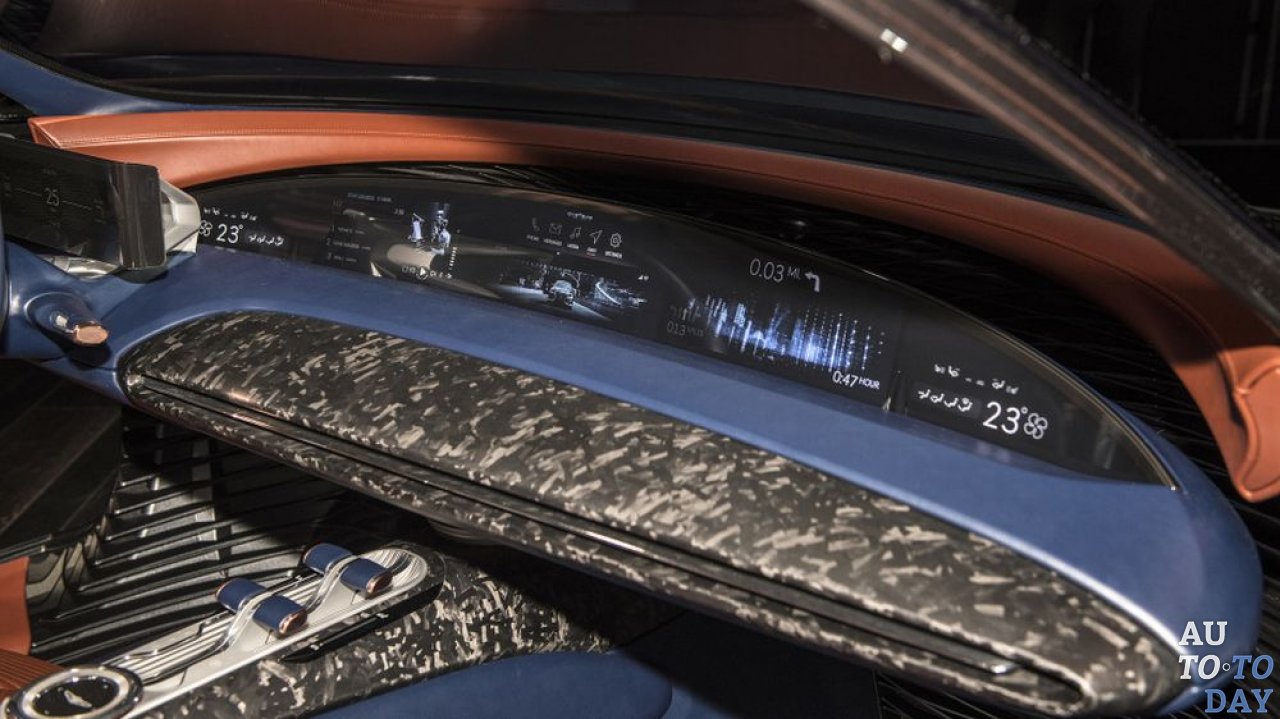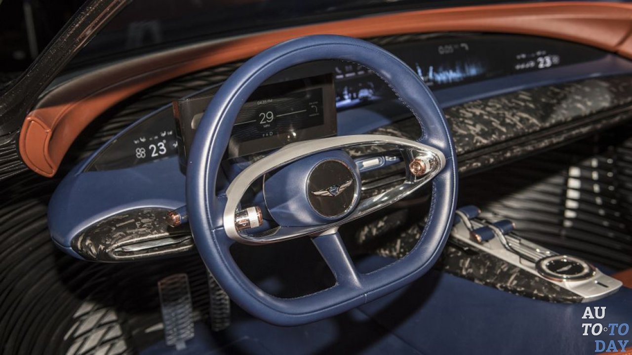 Внутри кокпит Essentia обертывается вокруг пассажиров по широкой дуге, визуально соединяющей цифровую приборную панель и двери. Genesis использует сочетание разных материалов по всему салону, от комфортных кожаных сидений с шевронным рисунком до слоистого углеродного волокна на приборной панели и центральной консоли.