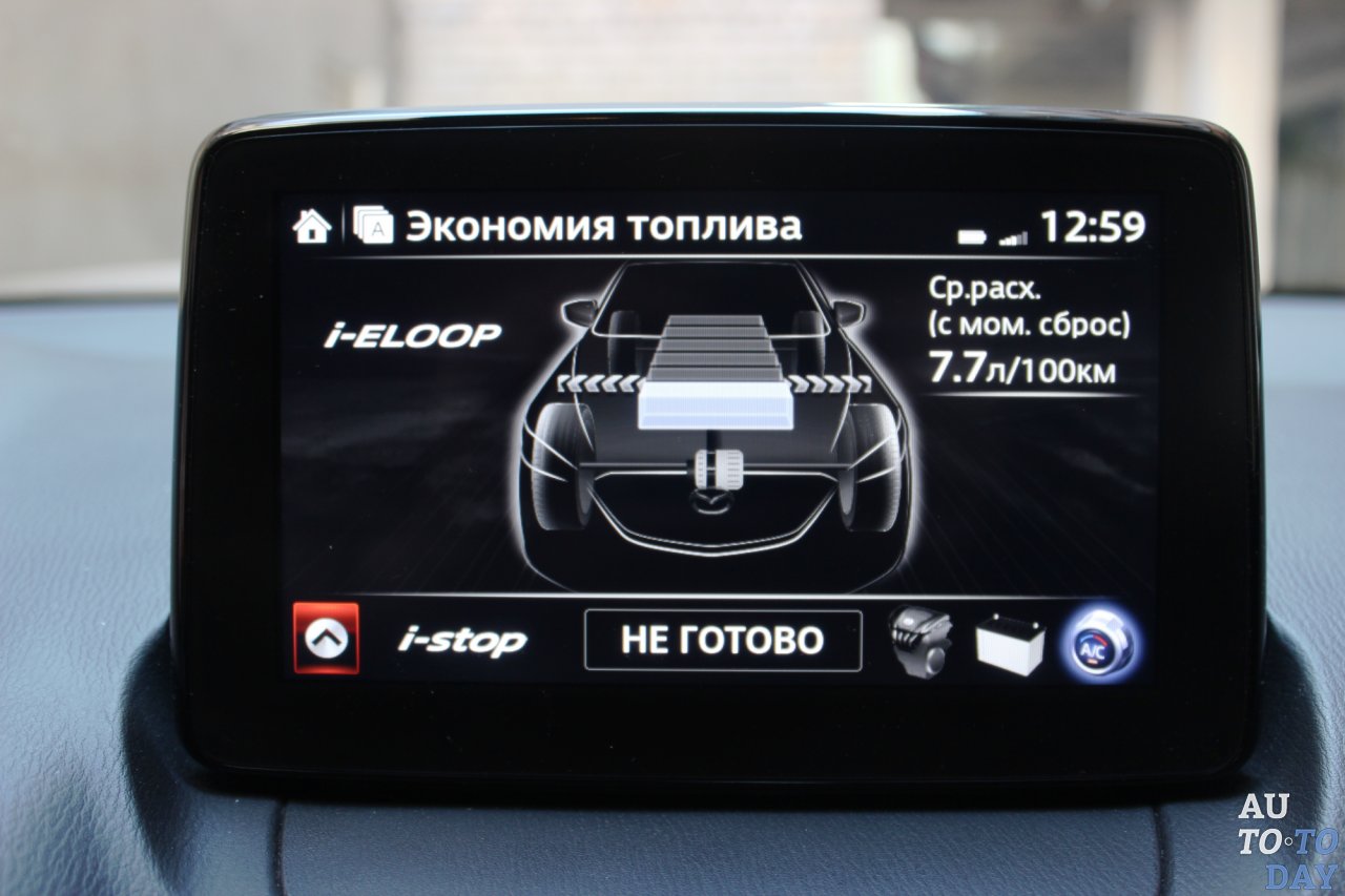 Мультимедийная система MZD CONNECT с 7-дюймовым сенсорным экраном хитрая: при стоянке и на скорости до 8 км/ч ею можно управлять через дисплей, дальше – только через джойстик. Безопасность, как ни крути. Навигация NAVTEQ и считывание аудиофайлов даже с обложками треков со смартфонов – в плюсах информационно-развлекательной системы. Главный недостаток – отсутствие поддержки протоколов Android Auto и Apple CarPlay.
