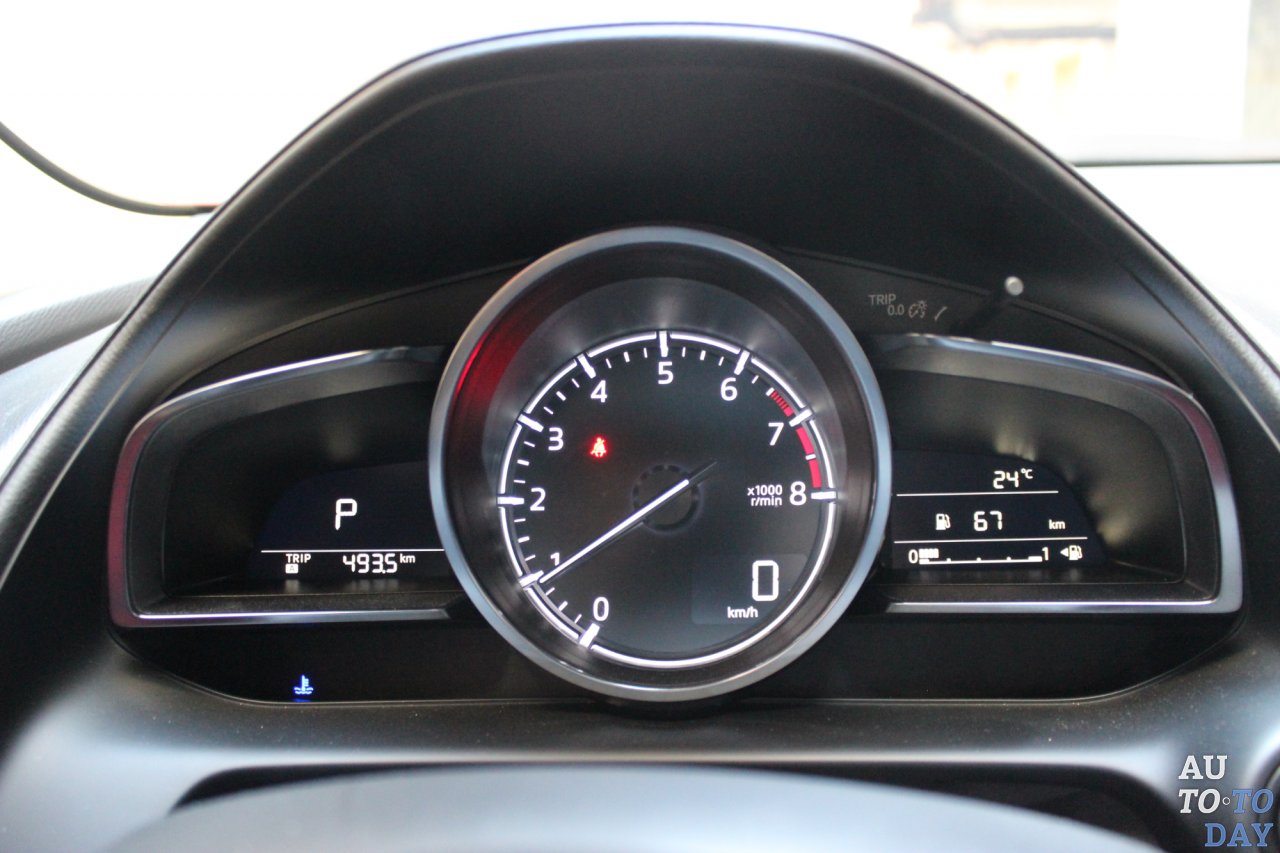 Попав в салон Mazda через широко распахнувшуюся дверь, моментально вспомнил свои осенние путешествия на родстере MX-5. Дизайн торпедо очень похож. Но всмотревшись, все же замечаю отличия – немного не там расположена «аварийка», центральные дефлекторы не такие. Консоль позаимствована у Mazda 2, блок климат-контроля и боковые дефлекторы точно такие! Таки похож. Впечатляет, что, несмотря на компактный класс, все внутри сделано добротно – дефлекторы крутятся без люфтов, кнопки даже минимально не болтаются, а все стыки – ровные и с минимальными зазорами. Собственно, подобный уровень работы с деталями, граничащий с премиальностью, имеет место и на «двойке».