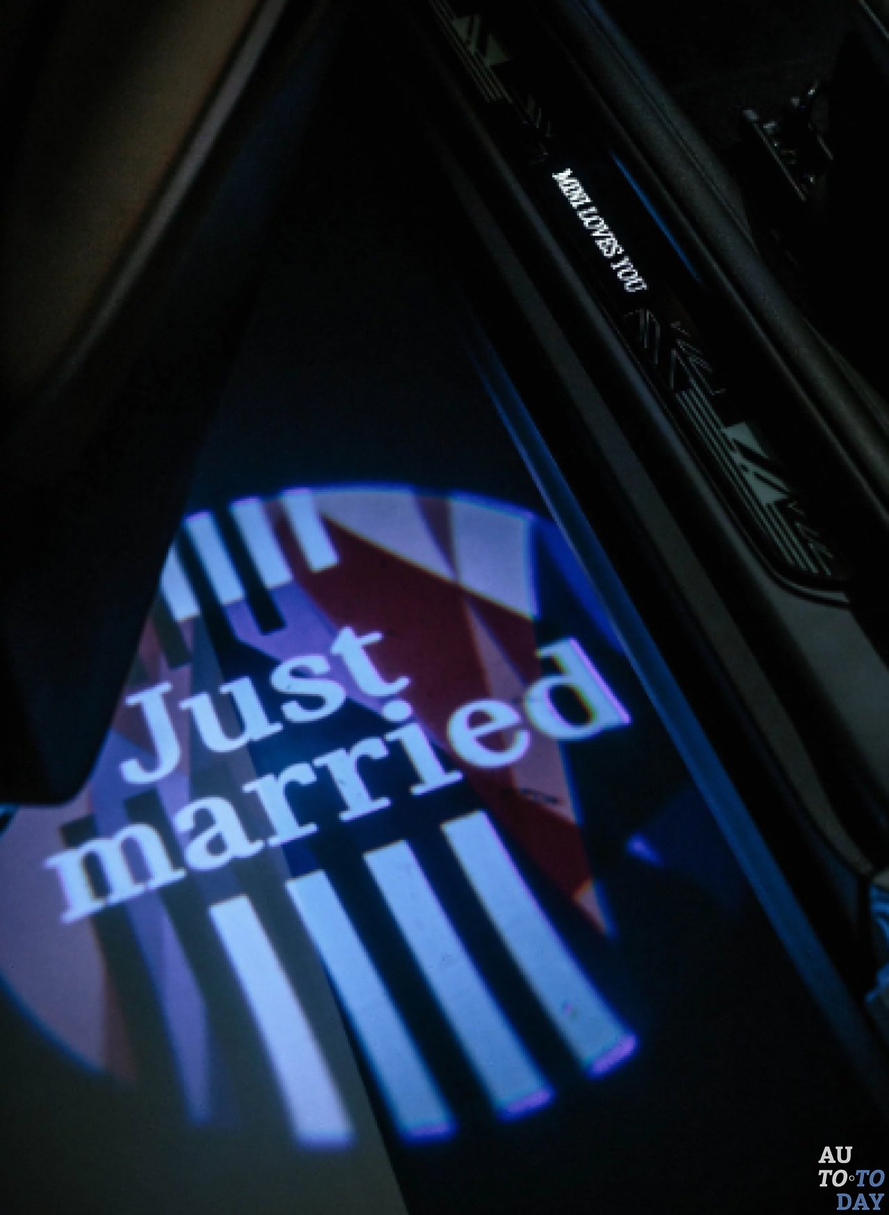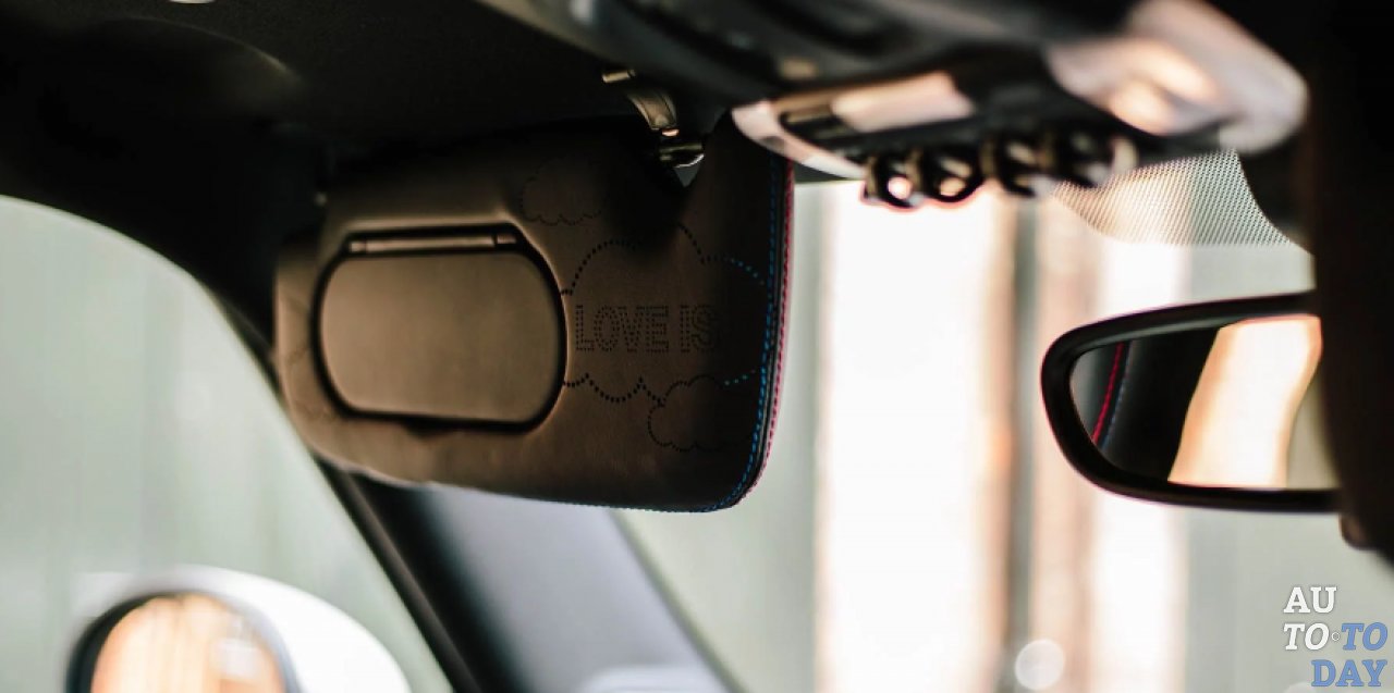 Роскошный Mini выполнен в оттенке Crystal White с серебристо-синими акцентами. Модель украшена матовыми полосками, эксклюзивными колесными дисками, 3D-напечатанными инициалами M&H и дополнена специальным проектором, который при открытии дверей отображает надпись Just Married (в переводе – Молодожены). Самая уникальная деталь автомобиля – крыша с графической аппликацией. Интерьер Mini выполнен в сером цвете, дополненном более темной отделкой с контрастной красно-синей прострочкой.