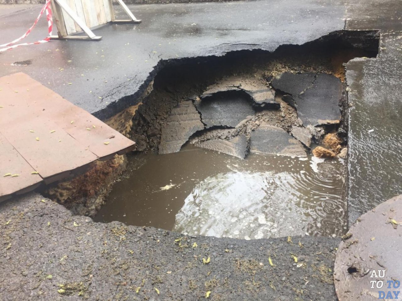 Очевидцы говорят, что яма появилась еще ночью с понедельника на вторник 8 мая. От нее уже успел пострадать один автомобиль. По предварительным данным, причиной обвала стал прорыв водопроводных труб, которые проходят под дорогой. Вода размыла землю под практически новым асфальтом, и он обвалился. Вокруг котлована поставлено ограждение, но ремонтные работы еще не начались. Если коммунальщики и дальше будут медлить, то размер ямы может увеличиться, так как вокруг нее уже образовались большие трещины.
