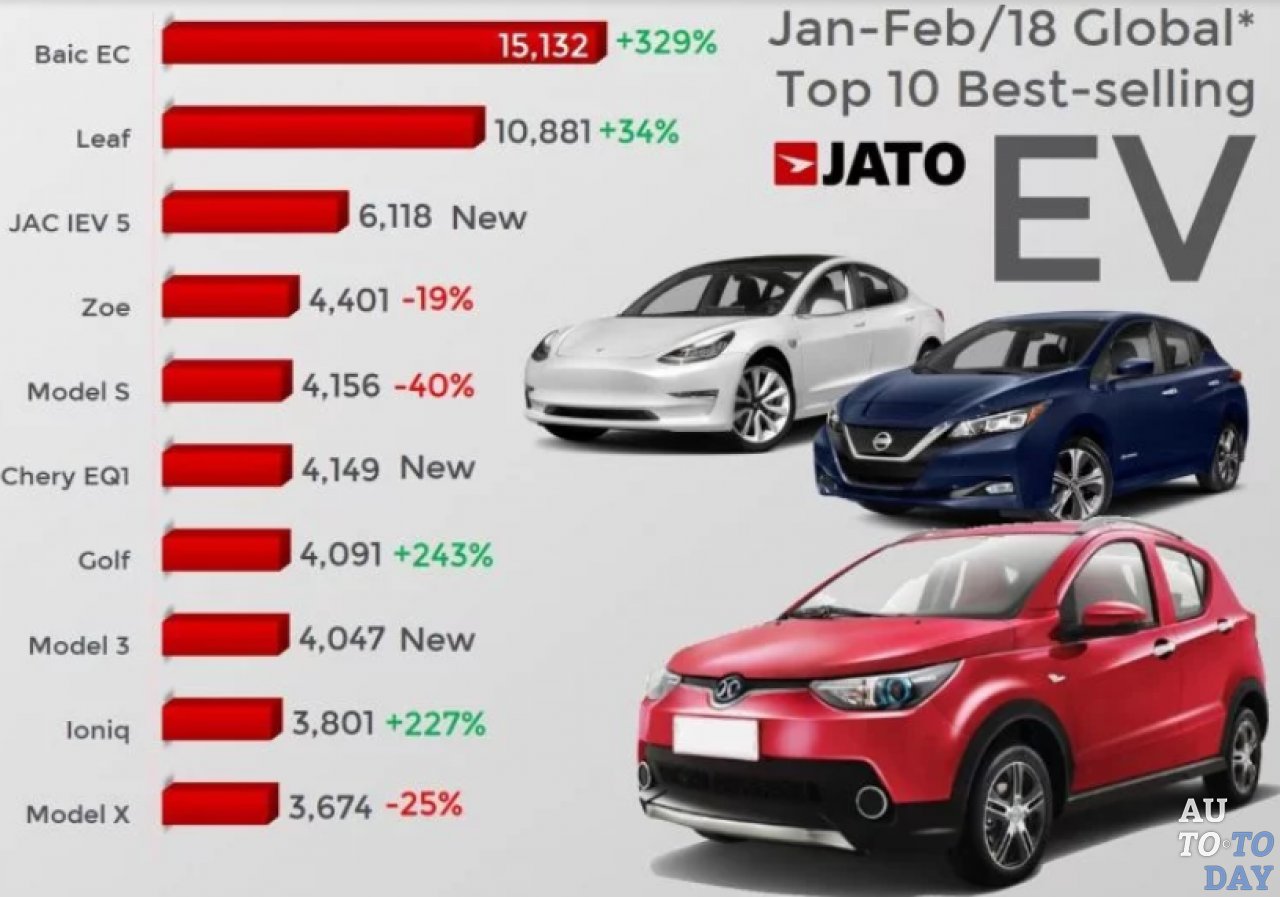 Роскошный Chery EQ1 с показателями в 4149 экземпляров занял шестую позицию, за которым последовал Volkswagen e-Golf с результатом в 4091 автомобилей. Tesla удалось отправить клиентам только 4047 единиц Model 3 за январь и февраль 2018 года, тогда как продажи Hyundai Ioniq остановились на позиции в 3801 штук. И последнюю десятую позицию в рейтинге самых продаваемых электрических транспортных средств занял Tesla Model X, количество отправленных моделей которого упало на 25 процентов и составило 3674 единицы.