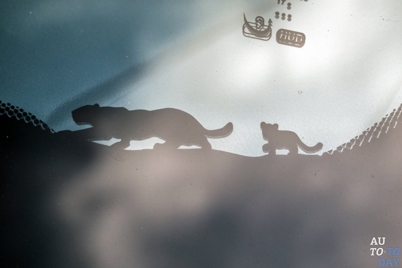 Хоть он и Jaguar, но называть его хищным и дерзким я бы не стал. Хотя облик его однозначно интересен. Спереди автомобиль похож на купе F-Type, прежде всего, за счет черной почти вертикальной решетки радиатора, чем фарами. Полностью светодиодная оптика и выразительна внешне, и работает достойно, умеет даже показывать пространство за поворотами. Но меня даже больше «прикололи» не фары, а освещение зоны посадки водителя, свет просто льется из боковых зеркал. Подсветка изображает ягуара побольше, и ягуара-котенка. Очень милая «пасхалка». Такую же пару особей семейства кошачьих можно обнаружить в правом нижнем углу на лобовом стекле.