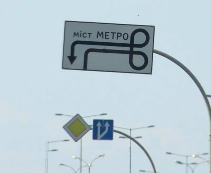 Появление весьма неоднозначного навигационного знака на подьезде к киевскому мосту метро ввело граждан в сметение... Интернет просто взорвался!