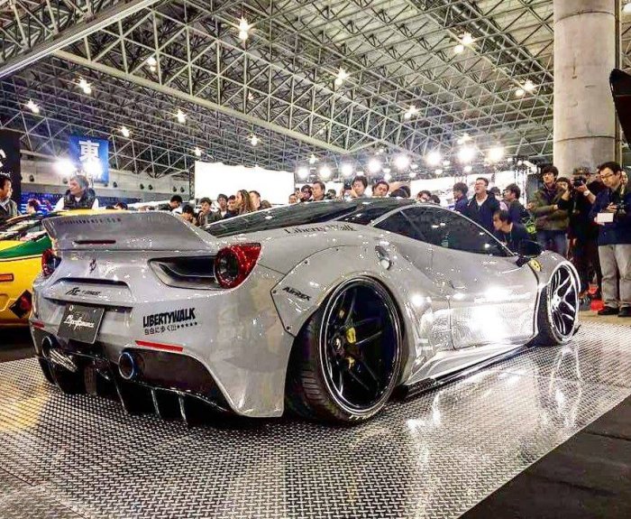 На этих фото вы видите модифицированный Ferrari 488, который получил уменьшенный клиренс от тюнингового ателье Liberty Walk. Дебют модели состоялся на автосалоне в Токио 2017 года.