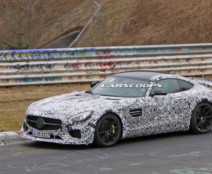 Прототип Mercedes-AMG GT был пойман шпионами на Нюрбургринге во время тестов. Большая часть машины завернута в виниловые наклейки, но район центрального выхлопа, указывающего нам на модель "R" и большого заднего крыла остаются видимым.