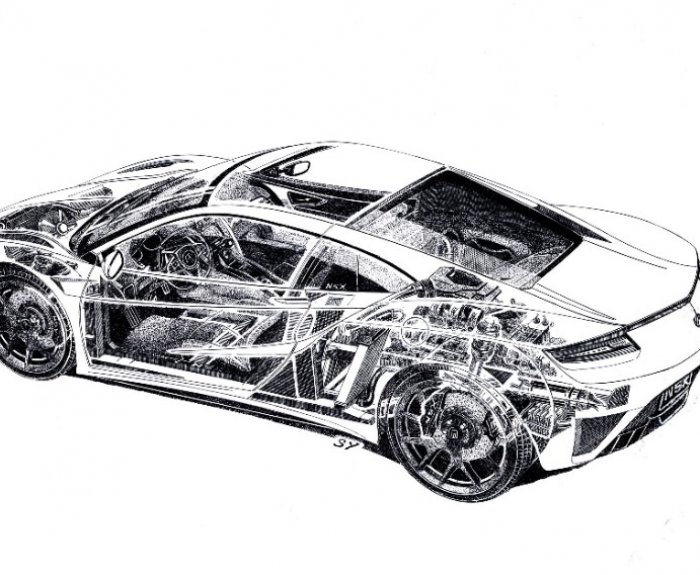 Нарисованный «легендарным автомобильным иллюстратором» Шин Йошикава, роскошный эскиз демонстрирует внутреннюю часть гибридного суперкара Honda.