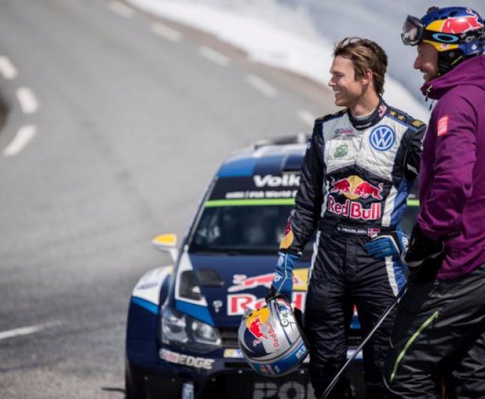 Необычную дуэль затеяли чемпион мира по горнолыжному спорту, норвежец Аксель Лунд Свиндаль и норвежский гонщик, пилота команды Volkswagen Андреас Миккельсен.