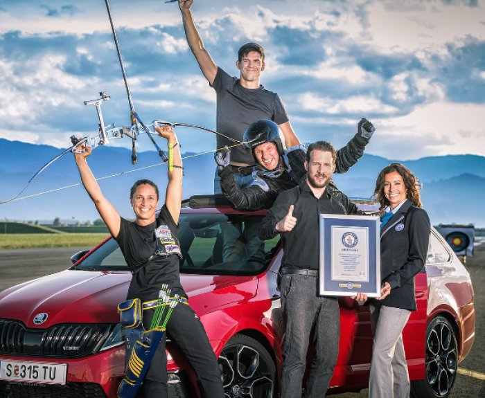 Используя Skoda Octavia RS 245, тренер по боевым искусствам Маркус Хаас сумел поймать летающую стрелу, «отправленную» австрийской олимпийской лучницей Лоуренс Балдауфф.