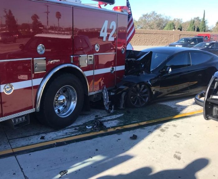 Согласно предоставленным данным на странице в Twitter, электрический автомобиль врезался в пожарную машину на скорости ...