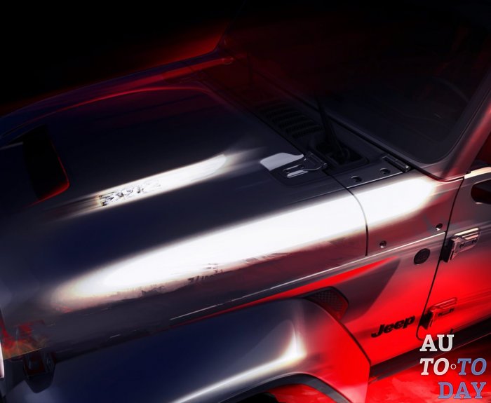 На этом тизерном изображении, недавно распространенном по каналам социальных сетей автопроизводителя, показана передняя часть «Рэнглера» или «Гладиатора» с выпуклым воздухозаборником, на котором имеется рисунок с надписью 392. Это может означать ...